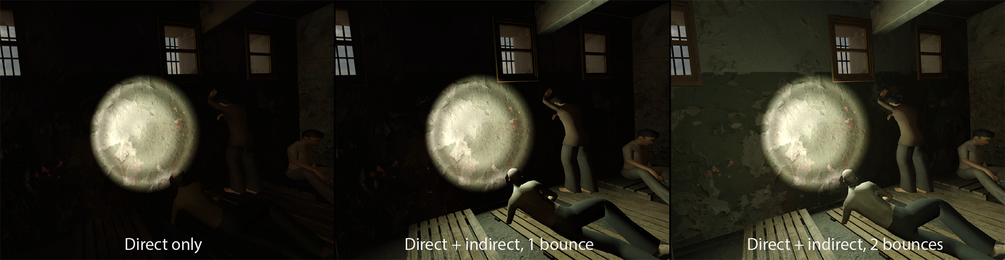 In scenes with intense lighting changes, such as the example shown in the following image, it would not seem realistic to pre-compute indirect light, a technique common in real-time graphics for games. For this purpose, a simple computational method was developed and applied, which simulates the diffuse reflection of light by placing and modulating virtual light sources on the surfaces the direct light scatters on (here from the prison guard's flashlight). For details please see G. Papaioannou, Approximate Dynamic Global Illumination for VR, Virtual Reality 29, 54, 2025.