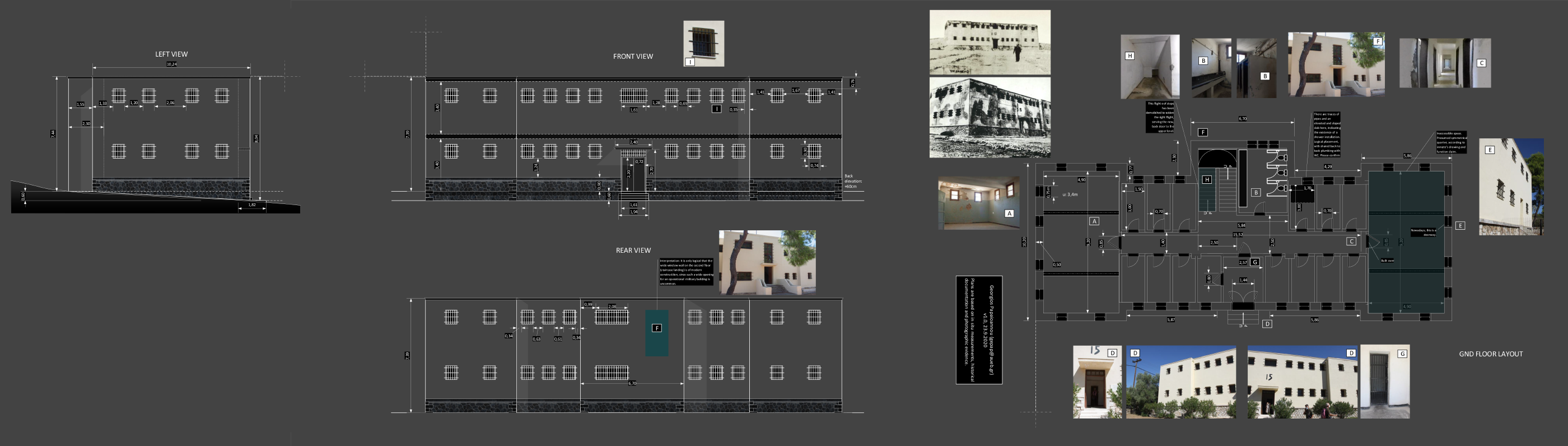 The current state and layout of the Haidari camp does not bear much similarity to the those of reference period of the scenario. There is little evidence remaining, as several buildings were demolished, restructured or expanded. The same applies to the perimeter of the old camp. For the representation of the outdoor spaces, we relied on sketches and post-period photographic material.
