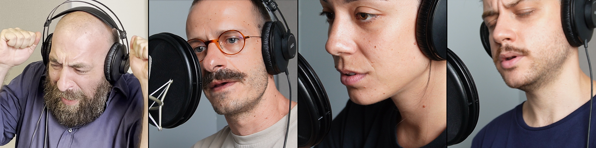 The voices were recorded based on the script's dialogues and testimonies, and the actors were filmed in order to allow the animators to synchronize the speech with the movement of the lips of the composite characters.