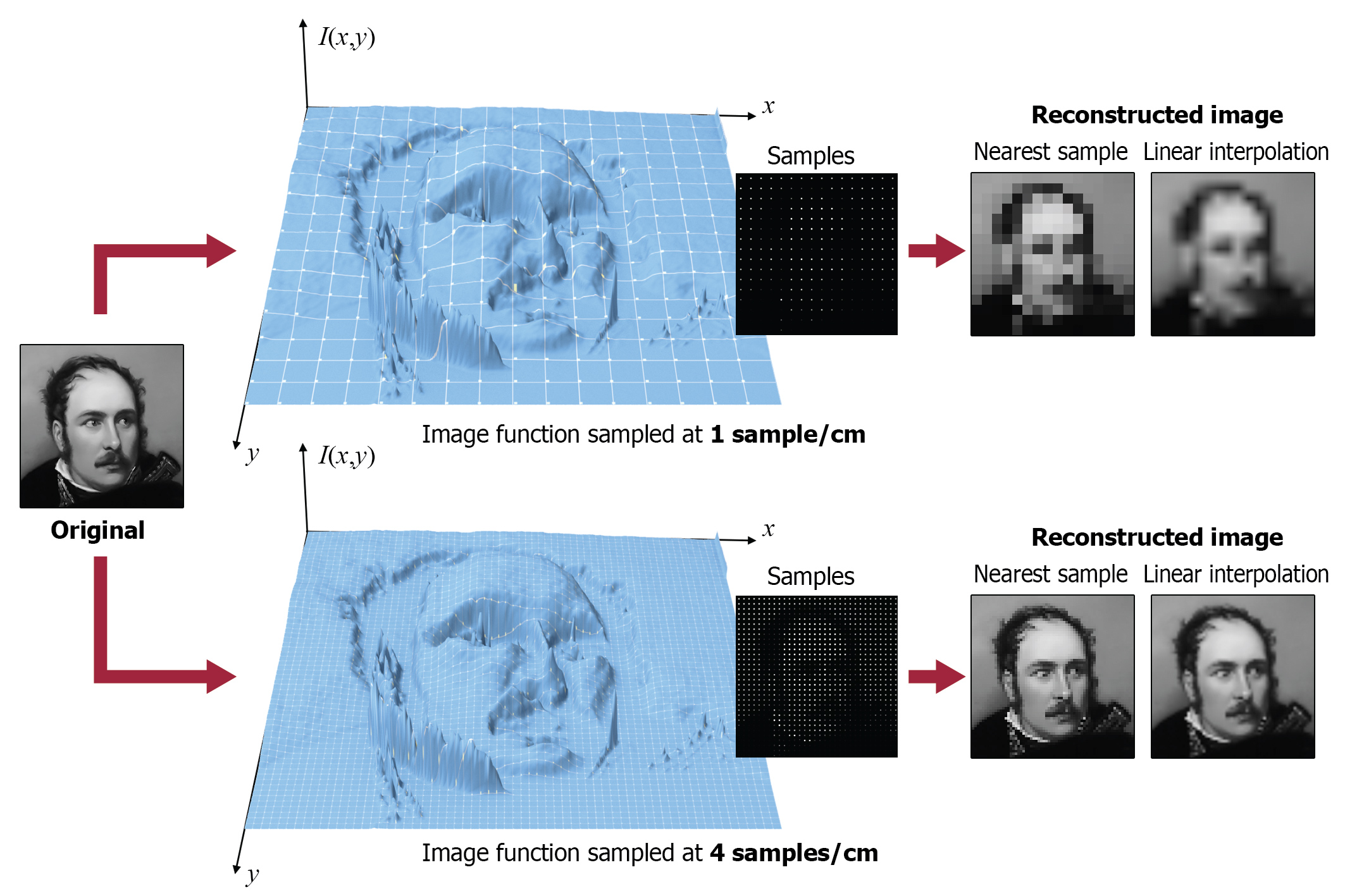 In order to process, reproduce or randomly access (in the case of computer graphics digital assets) a digitized signal, sampled information must be interpreted as their continuous counterpart, by various approximation techniques. The mathematical counterpart to this process is the convolution of the sample sequence with a reconstruction filter that "spreads" the individual samples to fill in the missing (continuous) information between the sample locations. Digitized or digitally born assets may be re-sampled at a different rate to be used in a certain information processing task. In essence the reconstruction filter performs an interpolation of the discrete values and in practice, established interpolation functions such as constant, linear or cubic interpolators are employed.