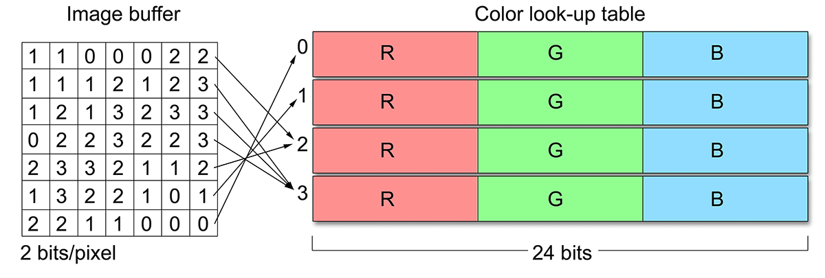 The above image representations are often referred to as true-colour, a name that reflects the fact that full colour intensity information is actually stored for each pixel. In paletted or indexed mode, the value at each cell of the image buffer does not directly represent the intensity of the image or the colour components at that location. Instead, an index is stored to an external colour look-up table (CLUT), also called a palette. An important benefit of using a paletted image is that the bits per pixel do not affect the accuracy of the displayed colour, but only the number of different colour values that can be simultaneously assigned to pixels. The palette entries may be true-colour values themselves. A typical example is the image buffer of the Graphics Interchange Format (GIF), a common format used for small-sized web assets, which uses 8 for colour indexing and 24-bit palette entries (see next figure). Another useful property of a palette representation is that pixel colours can be quickly changed for an arbitrarily large image. Nevertheless, true-colour images are usually preferred for image representation and processing, in general; integer formats offer simultaneous colours (large look-up tables are impractical) and image formats using floating-point (real) numbers only limit the values being represented by the numerical accuracy of the floating point convention employed. True colour data are of course also easier and faster to address and manipulate, since no de-referencing of the CLUT is necessary.
