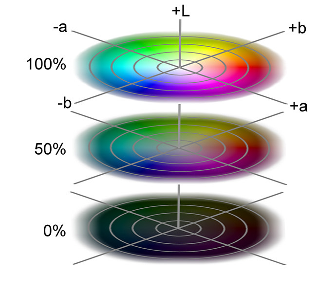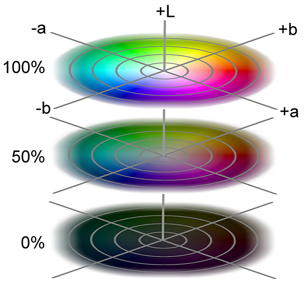 Once the opponent nature of color interpretation was understood, color scientists were able to create a model color space based on the opposing pairs. This is the Lab color space (Figure 3.5). The Lab variation of interest to us is officially called CIELAB. Each of the opposing pairs provides one axis of this three-dimensional color space. L is the axis for darkness to lightness; a is the axis for greenness to redness; and b is the axis for blueness to yellowness. By providing a value for each of the L, a, and b attributes, a color is accurately and uniquely located in the color space. The tremendous utility of the Lab color space is that it allows for the mathematical description of a color in a non-ambiguous and meaningful way.