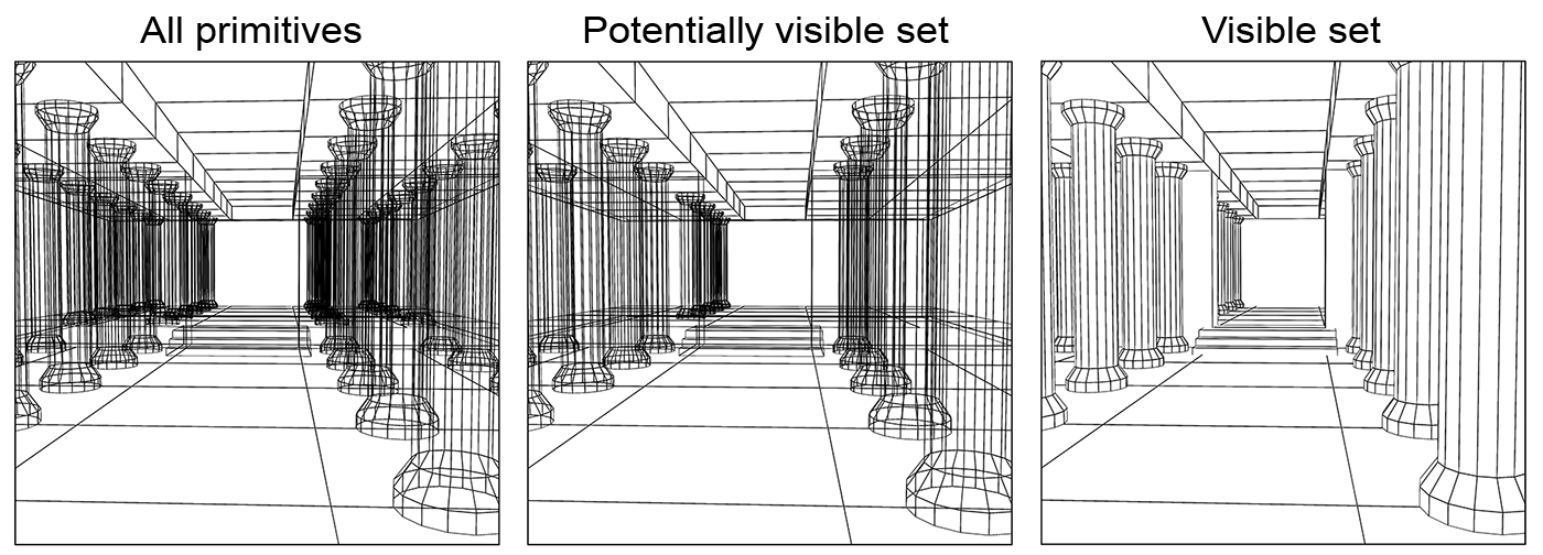 In some cases, hidden surface elimination is assisted by a more high-level procedure that can precede an accurate depth-sorting stage, which is the determination of the potentially visible surface set, as shown in the figure below. In this stage, we can discard parts of the geometry that are definitely not going to appear in the image, usually because their are either off-view or definitely obscured by other elements.