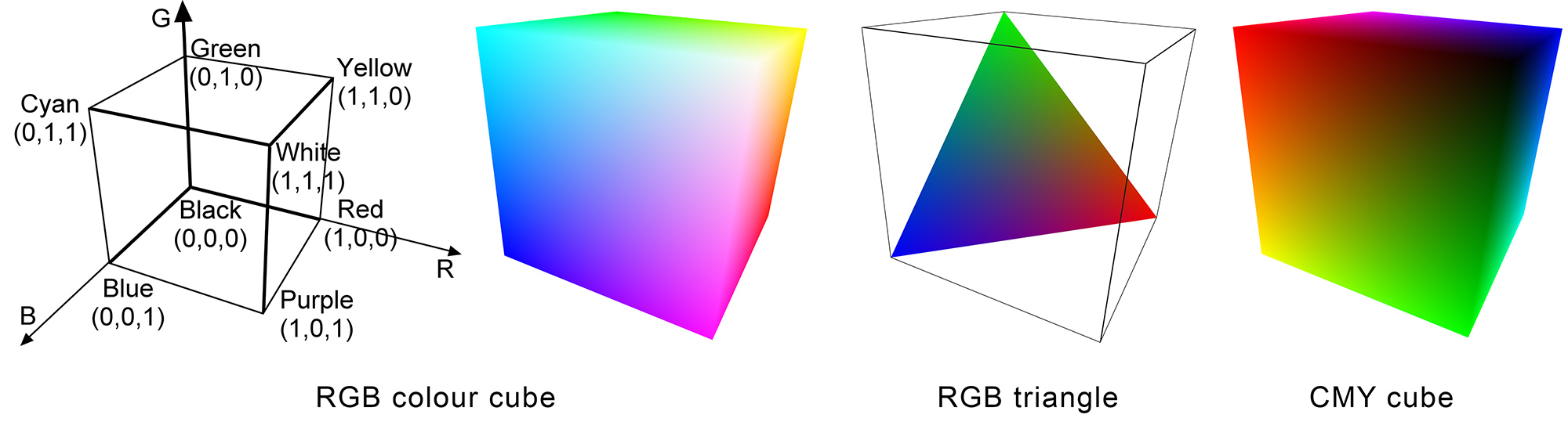 The CMY model is defined as the complement of RGB. Its three basic colors are Cyan, Magenta and Yellow. White appears at and black at the opposite vertex ; other colors are also in opposite vertices with respect to the RGB cube.