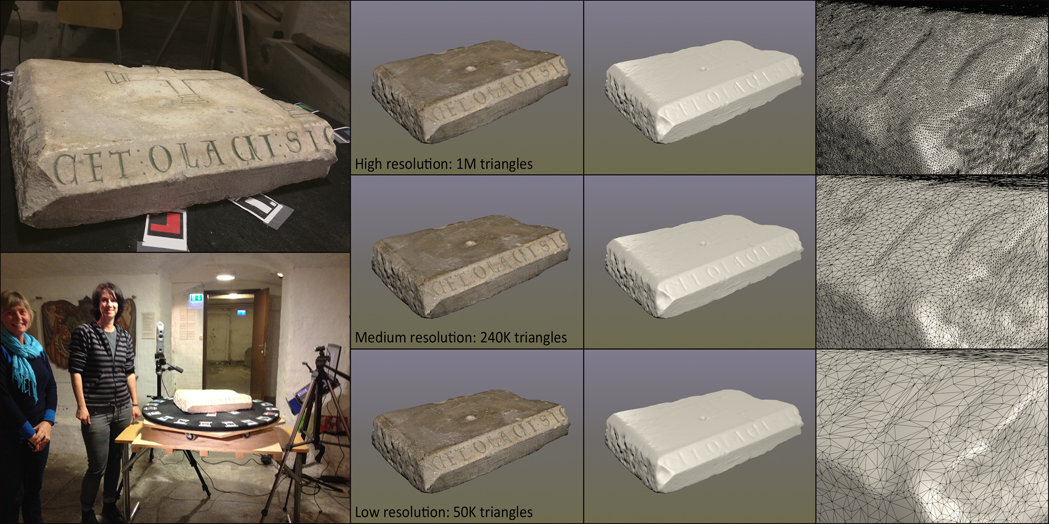 Typically we produce multiple versions of a digitized artefact, intended for different purposes. The example in the following figure demonstrates this: A high resolution version of a 3D scan is acquired and archived along with the raw input. Then the point cloud is reduced to obtain a more manageable volume of information for processing and computer-based analysis (medium resolution). Finally, the geometry is further reduced to get a low-resolution version of the model that is better-suited for display on low-end systems or the web.
