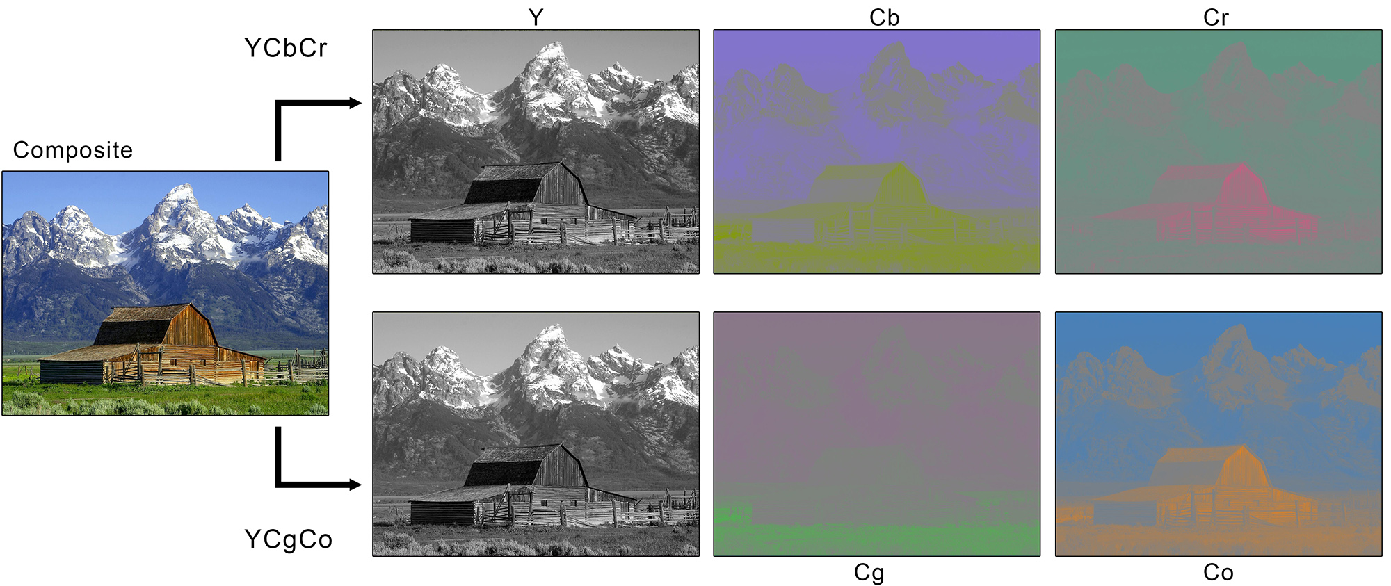 The YCgCo (often written YCoCg) color space is similar in nature to the YCbCr, but encodes chrominance in two different axes, the chrominance orange (Co) and the chrominance green (Cg). It is primarily used in the H.264 video format and is considered superior in terms of information decorrelation across the color planes.