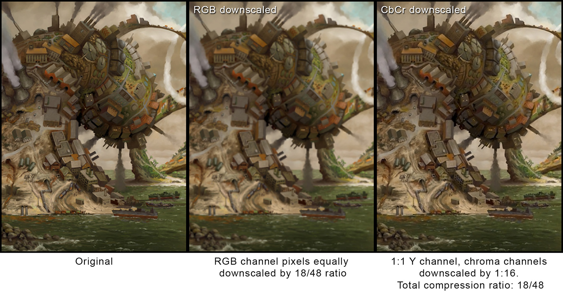 The primary use of a YCC space is image compression. It allows the efficient compression of image information in a perceptually optimal manner, by retaining as much information possible in the luma channel and aggressively reducing the (spatial) resolution of the two chroma channels, as shown in the next figure. The Human Visual System luminance visual acuity is greater than the discrimination of chrominance variations and therefore we can subsample the chroma channels without much perceptual degradation. For the majority of typical image presentation scenarios, luminance is perceptually more important and with a faster variance across the image domain. However, in extreme cases, since color information is subsampled and then expanded to fill the same pixel area, sharp chromatic transitions (e.g. a red rose over a green background) will cause color bleeding and desaturation in the rectified image.
