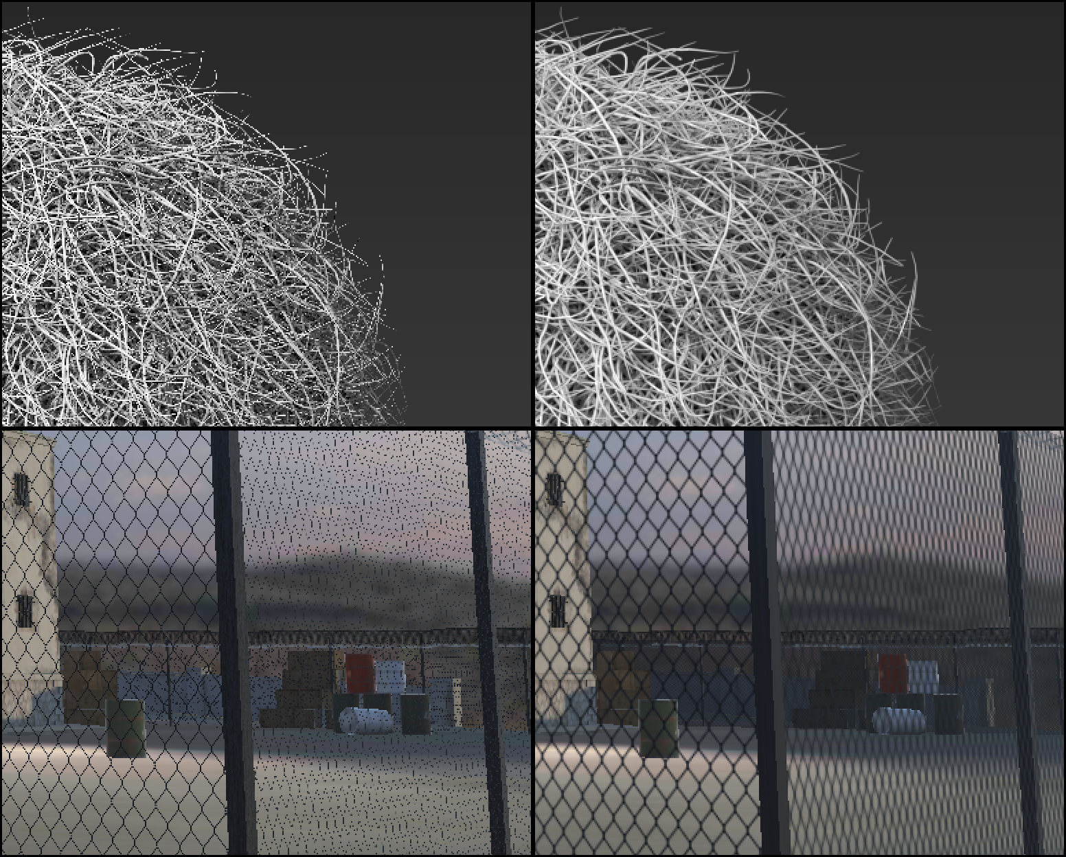 In computer graphics, aliasing is frequently manifested during image synthesis, when regularly sampling the image buffer domain (pixel-sized sampling period). Textural detail on surfaces or thin structures, with thickness or contrast variations smaller than 2 pixels, will be poorly represented by the raster image, resulting in noisy, temporally unstable patterns, often deviating significantly from the intended signal. Examples of the phenomenon are shown in the following figure.