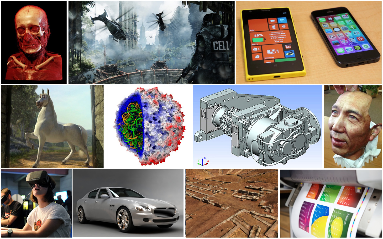 The applications of computer graphics are numerous and ubiquitous. Nowadays, computer games and interactive systems and software of all kinds constitute the main field of CG applications. In the last decades, computer games and interactive rendering drive the state of the art in high-efficiency algorithms and graphics hardware. Computer-Aided Design (CAD), Manufacturing (CAM) and Engineering (CAE) software systems use computer graphics for the physical product design using surface and solid modeling and geometric tools as well as the reverse engineering and simulation of physical objects and their properties.