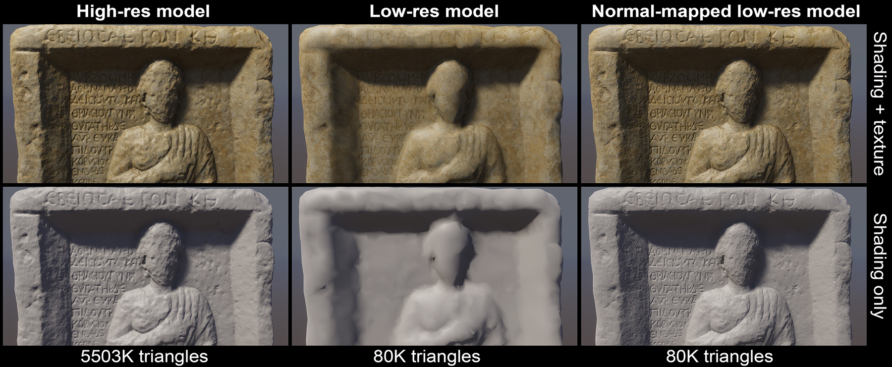 Furthermore, low-resolution 3D models can still visually represent their high-resolution counterparts, when established detail transfer techniques are exploited, such as normal "baking", which maps surface detail of the high-fidelity model as surface orientation texturing on the low-resolution one, as demonstrated in the figure below.