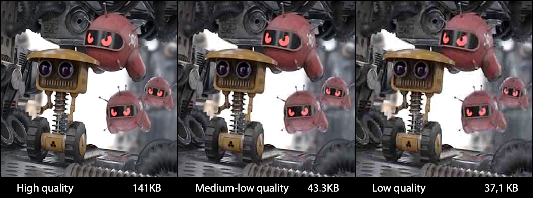 Remark: What format is appropriate for me? In computer graphics, image assets are used a lot to describe the texture of a surface or the appearance of widget or game sprite. Surface properties such as base colour, can use a typical JPEG format (with lossy compression), while other attributes can produce visible artifacts, when their values are drawn from texture images with lossy compression, such as reflectance and roughness maps. Image synthesis results are better stored in a high-precision integer or floating point format (EXR, TIFF, TGA) so that their exposure can be post-processed. For sprites and other on-screen entities that need to appear "perforated" and see-through, a file format that supports an opacity channel is useful (PNG, TIFF), so that this information needs not be saved in a separate file.