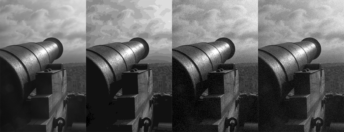 In certain situations, where we have abundant spatial resolution and can trade it for grey-scale resolution, we can effectively mask deficiencies of the color representation quantization levels by superimposing a noise-like pattern to the image, a processed called dithering, thus suppressing banding artifacts. The human eye is quite bad at discerning high-frequency patterns and locally varying the contrast can effectively take advantage of its perceptual deficiencies to create the illusion of better brightness grading.