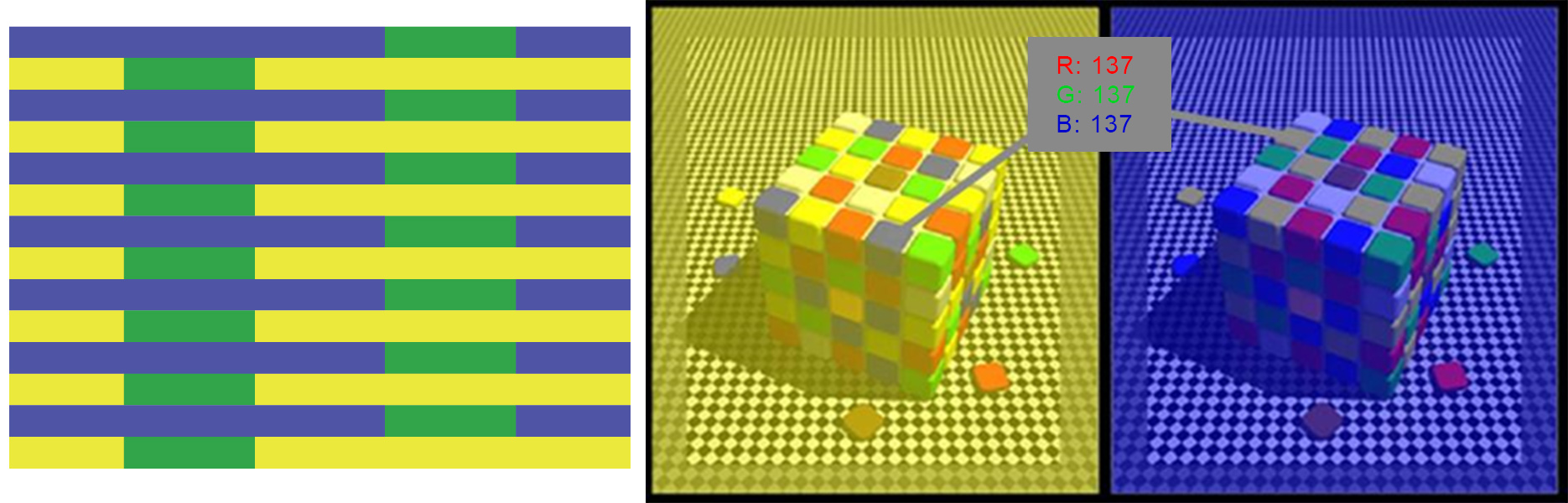 The effect of adjacency is very similar to color constancy. A color placed next to a light color appears darker than when that same color is placed next to a dark color (see examples in the next figure). We make adjustments to our interpretation based on our assessment of the environment. When making tonal adjustments as a post-processing operation on still images, a video or an interactive production, we should take great care not to get confused by our tendency to adjust colors based on the surrounding tonality.