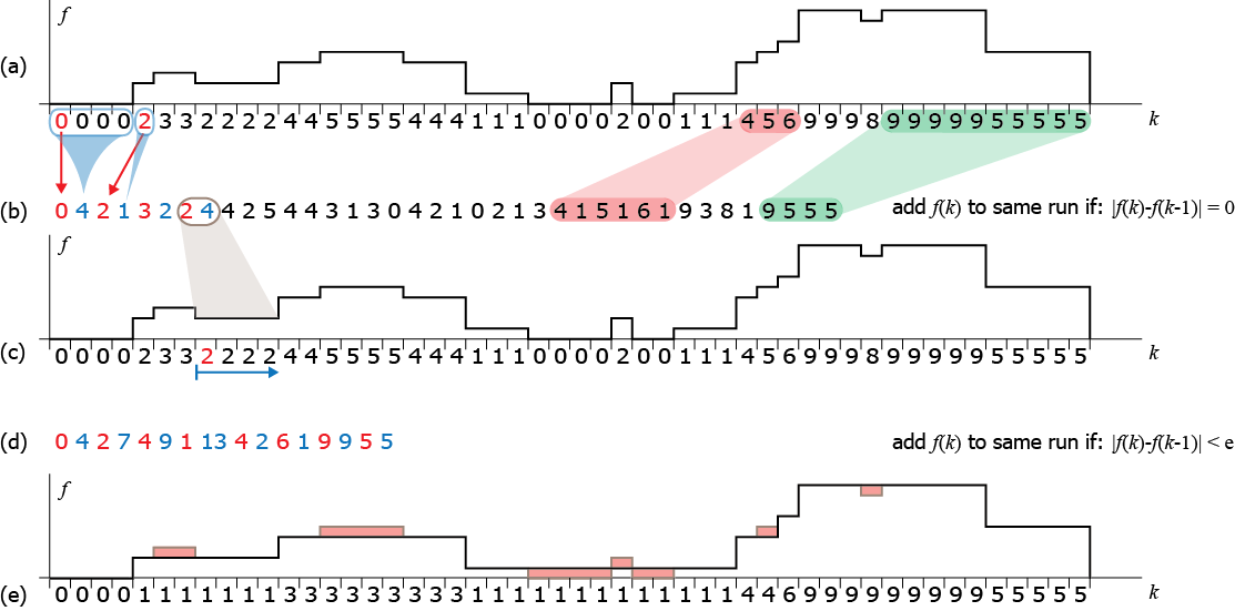 A simple example of lossless and lossy compression is shown in the following figure. A one-dimensional signal is compressed using a well-known lossless scheme: runlength encoding (RLE): consecutive identical values are replaced in the encoded sequence with the value and the number of times the value is encountered (b). This form of encoding significantly compresses runs of flat values (shown in green in (a)) but is very inefficient for highly variable data. Still, on average, it effectively reduces the size of most signals. The recovery of the original signal is straightforward as we only have to repeat a value to the output of the decoder as many times as explicitly recorded in the encoded sequence (c). Comparing the original and decoded signals (a and c) we can easily observe that RLE is a lossless compression method. To increase its compression efficiency, in (d) we allowed for some error to be introduced in the encoding process: instead of accepting only identical values in the current run that is being identified and encoded, we also accept values that differ less than an error margin (here 2) from the run value. As a result, longer sequences are converted to contiguous runs and tightly encoded. However, the decoded signal (e) has lost the corresponding variations and differs from the original.