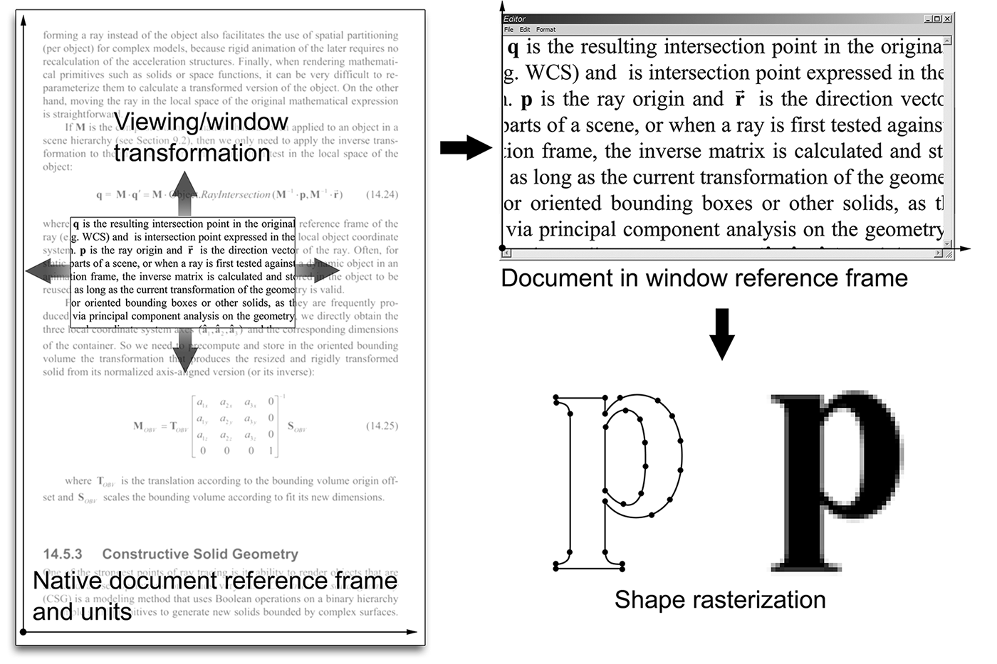 For two-dimensional drawings, think of a canvas where text, line drawings, and other shapes are arranged in specific locations by manipulating them on a plane or directly drawing curves on the canvas. Everything is expressed in the reference frame of the canvas, possibly in real-world units. We then need to display this mathematically defined document in a window, e.g., on our favorite word-processing or document-publishing application. What we define is a virtual window in the possibly infinite space of the document canvas. We then “capture” (render) the contents of the window into an image buffer by converting the transformed mathematical representations visible within the window to pixel intensities via rasterization, i.e. regular sampling on a grid (or raster).