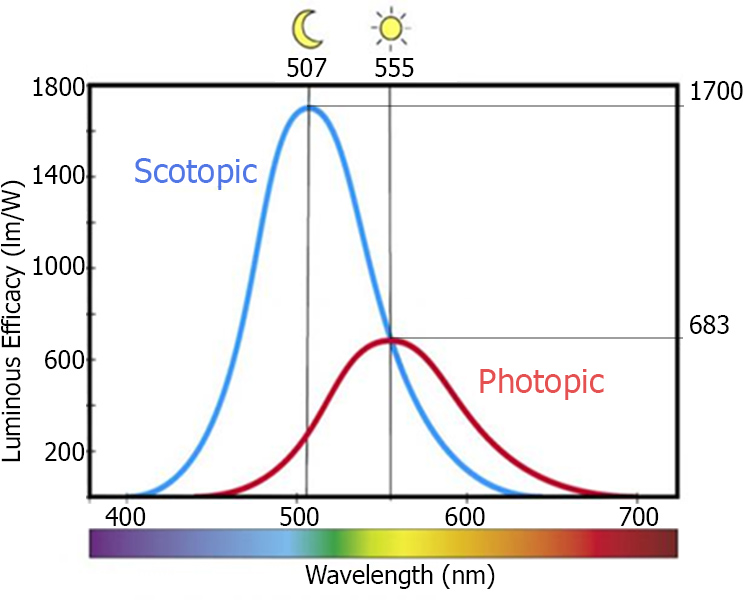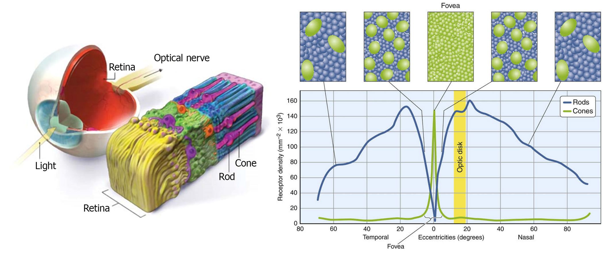 We encounter about 100 million rods in a human eye, with their population spread fairly evenly about the retina, except at the fovea, where there are almost none. Fewer cones (about 6 to 7 million) are mainly located around the fovea, but can be also found in a much lower density in the entire retina. No photoreceptors are found at the point where the optic nerve attaches to the eye (the so-called blind spot). With regard to the connectivity of rods and cones, an analysis of the neural circuitry of the human eye reveals a tendency of the photoreceptors to be connected with dedicated "lines" to the optic nerve, while moving to the periphery of the retina, photoreceptors tend to become aggregated. This is the primary reason why our visual acuity is higher in the fovea and also linked with the photopic vision, mostly due to the cones. The cumulative effect of all receptors combined is a frequency response mainly centerd at green hues, as shown in the next figure. This means that we can better discriminate shades of green and bluish green (after all we are descendants of a tree-dwelling species).