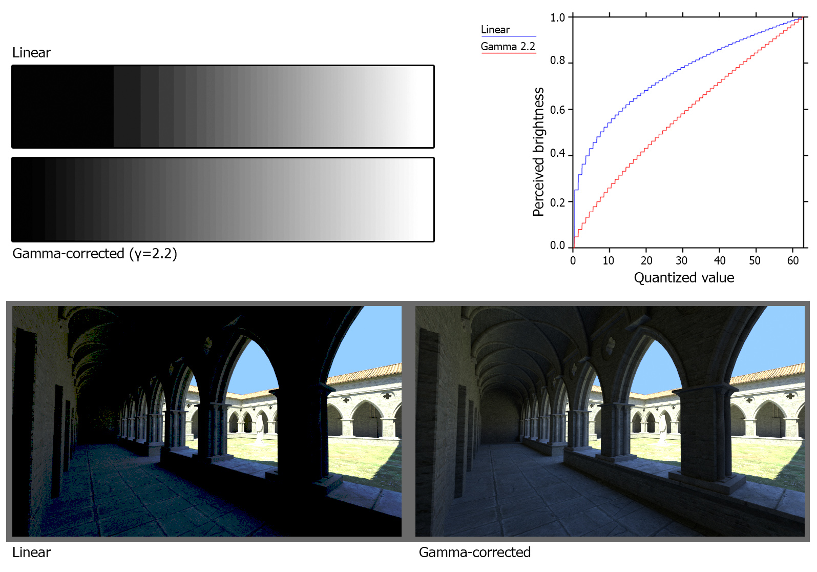 Photography and computer-generated images capture light in linear luminance space, i.e. as received by the "sensor". However, as already mentioned, we perceive these values non-linearly. If we convert the linear range to a fixed-quantization representation (e.g. RGB color with 8 bits per color channel - 24bit color images), we discriminate dim color transitions (images appear quantized) as we boost low luminance value differences. Furthermore, we fail to differentiate bright differences, thus wasting bits in our numerical representation.