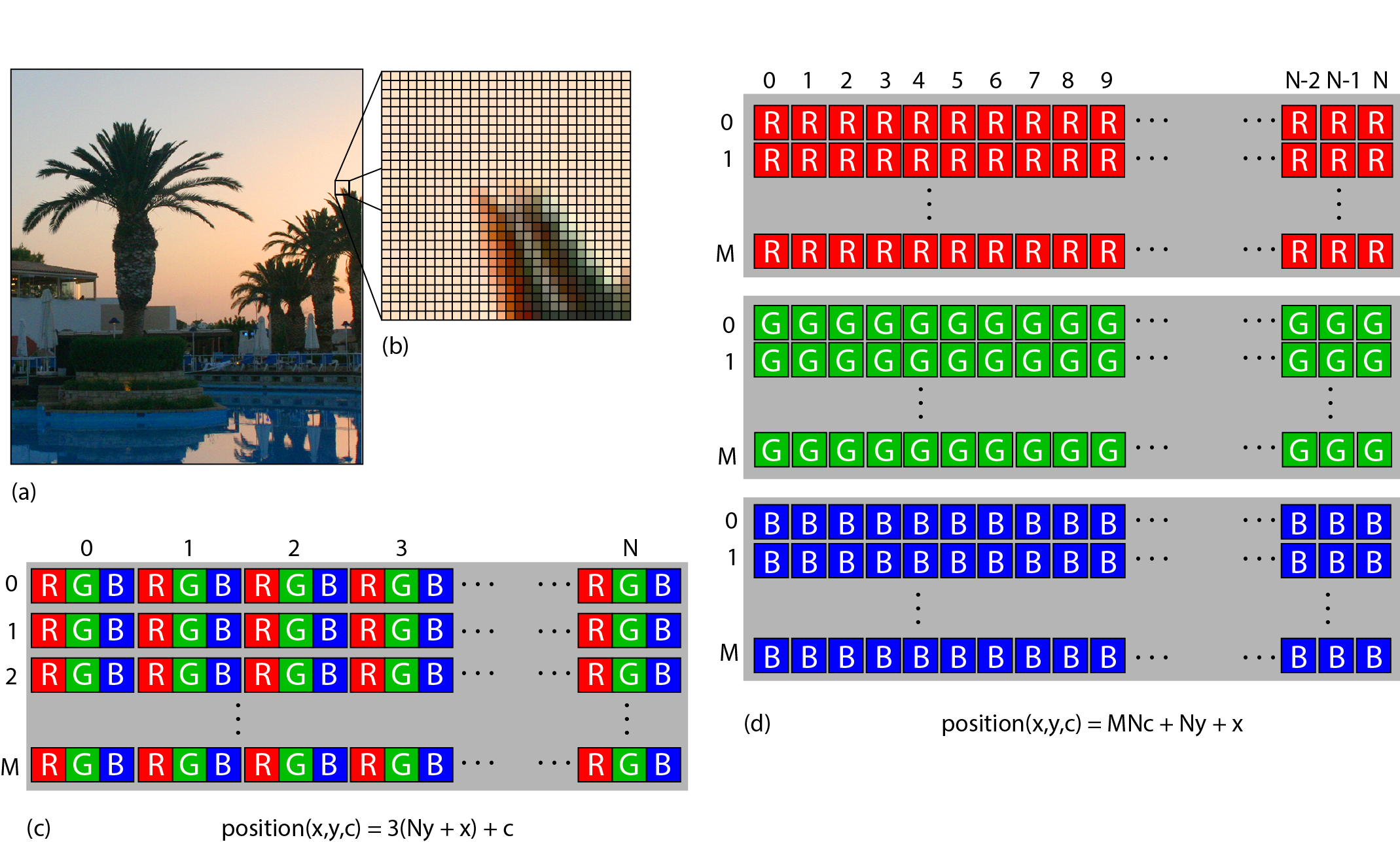 In multi-channel colour images, a similar encoding to the monochromatic case is used for each of the components that comprise the colour information. Typically, colour values in image buffers are represented by three channels, e.g. red, green and blue. For colour images, typical colour depths for integer representation are 24 and 48 . The colour components of a pixel are typically laid out in two arrangements for both file and in-memory storage: interleaved or in colour planes. In the first, the colour channels for a specific pixel are packed together one after the other in memory, forming an interleaved pattern. In the example of inset (c) in the following figure, the RGB data of an image are stored this way, forming a sequence of (RGB)(RGB)...(RGB) colour triplets in memory. In the alternative schema, the colour plane arrangement, individual colour components for the entire image are packed together one after the other, as shown in inset (d). There are merits for using either option as well as more intricate alternative storage patterns, such as the ones used for storing image textures in GPU memory. For operations on the image that perform calculations on all colour components of a pixel at once (e.g. grey-scale colour average) the interleaved mode is preferable as the data needed are close in memory (remember an image array is a big sequence of bytes) and therefore more likely to be in the processor cache. On the other hand, when applying an image filter on the colour channels separately (e.g. smoothing or median filters), arranging the colour values in planes ensures faster access to neighbouring values across different colours.