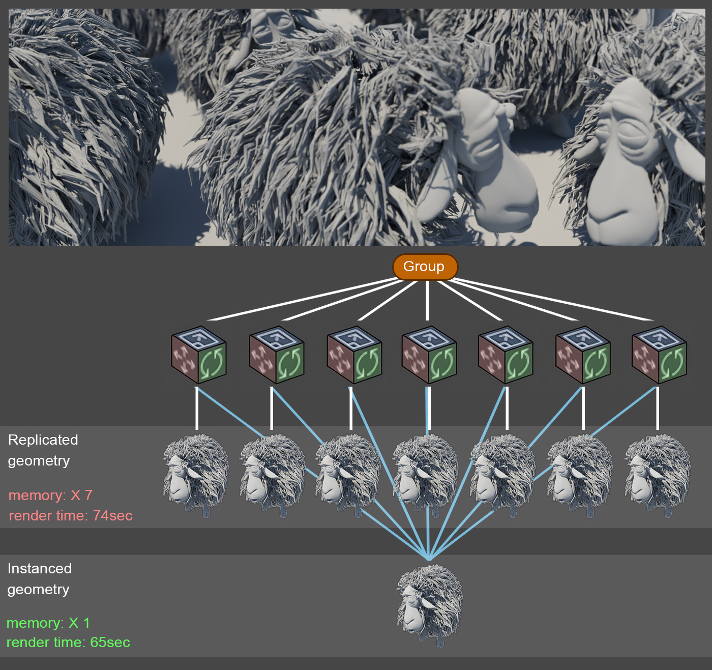 In a scene graph, geometry of identical objects does not need to be replicated, unless it must undergo a fundamental change in its topology or shape. It is beneficial both in terms of memory consumption and display performance to retain a single copy of the actual geometry and present it at a different size and pose by providing a distinct geometric transformation to each instance of the object. All instances internally reference the same geometric information, however, as shown in the figure below.