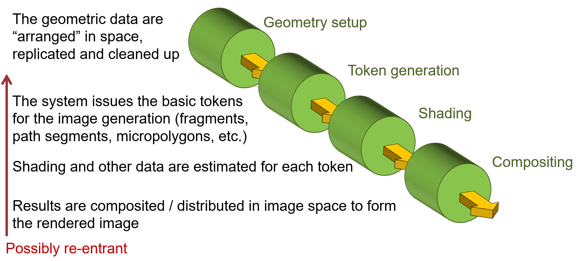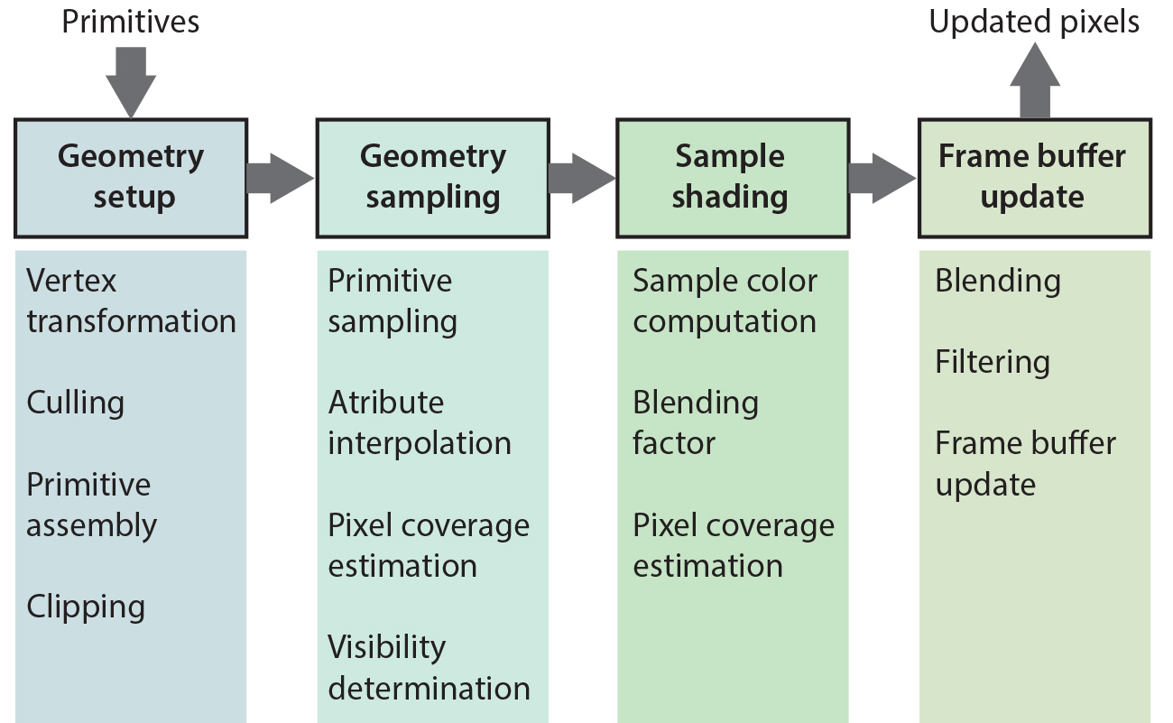A high-level, conceptual overview of a rendering pipeline is presented in the figure below. Actual practical rendering pipelines such as the rasterization pipeline and the ray tracing paradigm can all be thought of as concrete instantiations of this abstract pipeline model. Furthermore, graphics pipelines, no matter how diverse, share many steps, concepts, mathematical models and tasks, such as geometric transformations, texturing, local sample shading, etc.