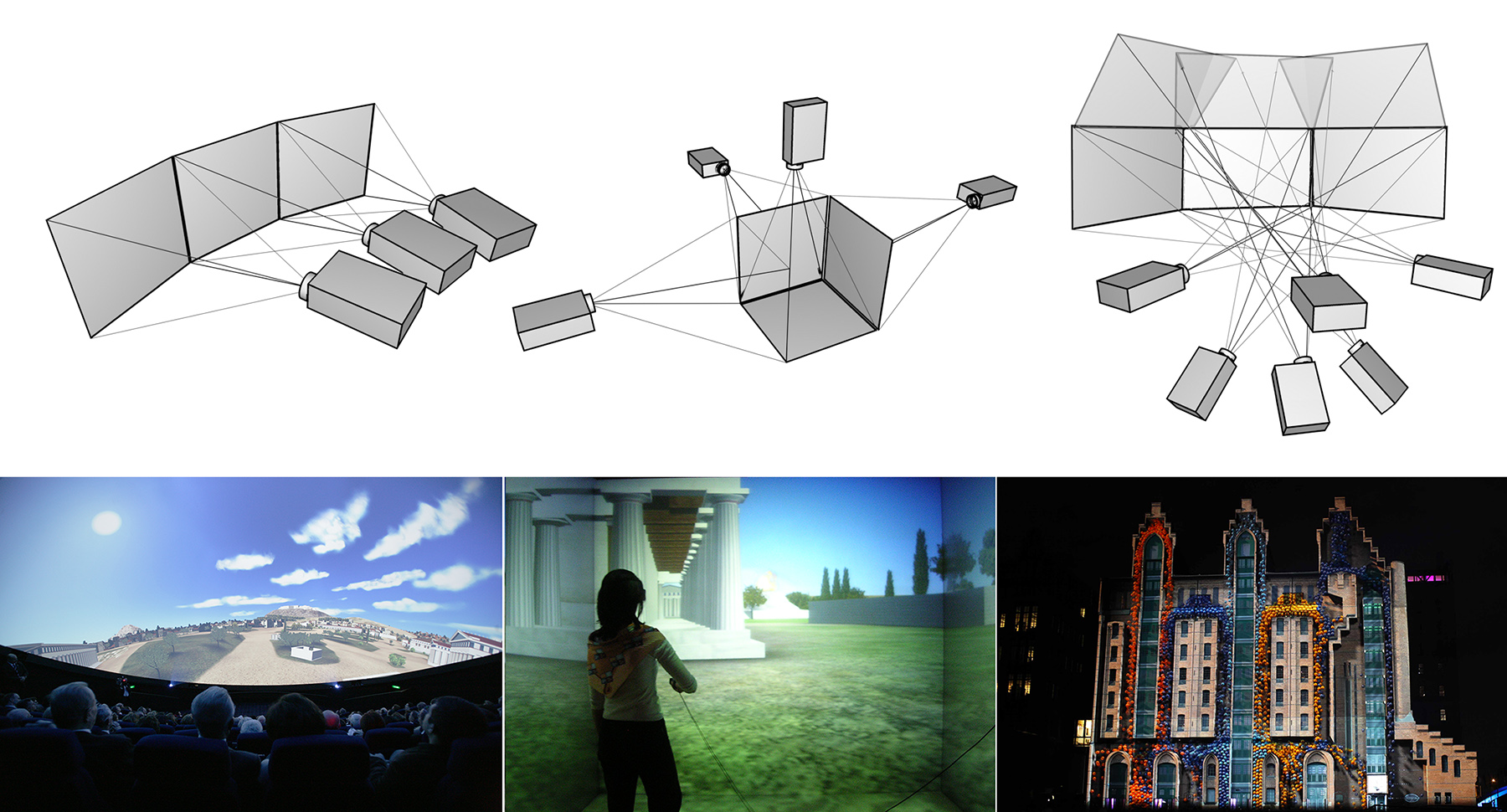 In exhibitions and museums, both technologies offer attractive advantages and are equally used. Back-projection systems are "invisible", as they can be seamlessly integrated into panelling, and their beams are not affected by visitors and other obstacles. On the other hand, front-projection systems offer much brighter images and can be easily configured in multiple projector setups to display content on large and curved surfaces and the floor, or be used for projection mapping, i.e. the art of exploiting the shape of real geometry to alter the illumination reflected off it using properly aligned projectors and suitable content.