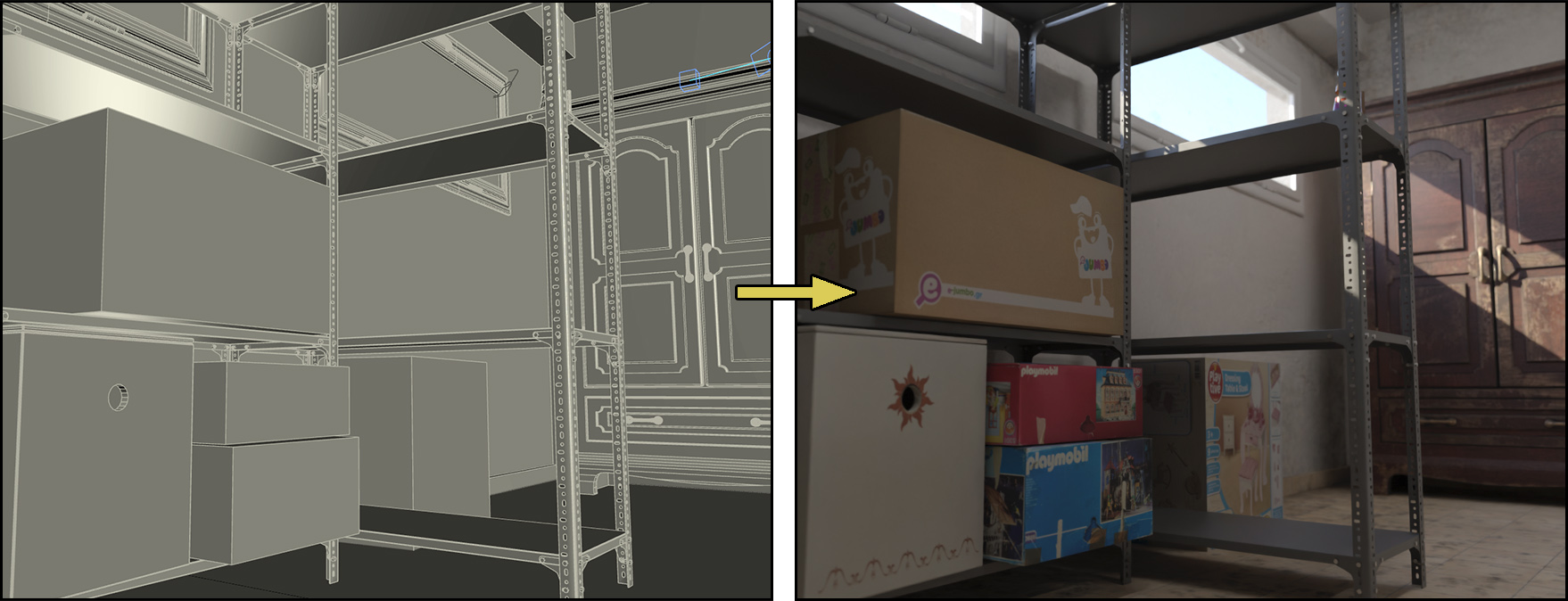 How objects are shaded: The energy (light) that is transmitted inside the virtual environment, illuminates the 3D geometry and is finally observed and recorded on the virtual camera, after being scattered on the surfaces or through the volume of objects. The lighting computations are done using a mathematical or statistical illumination model.