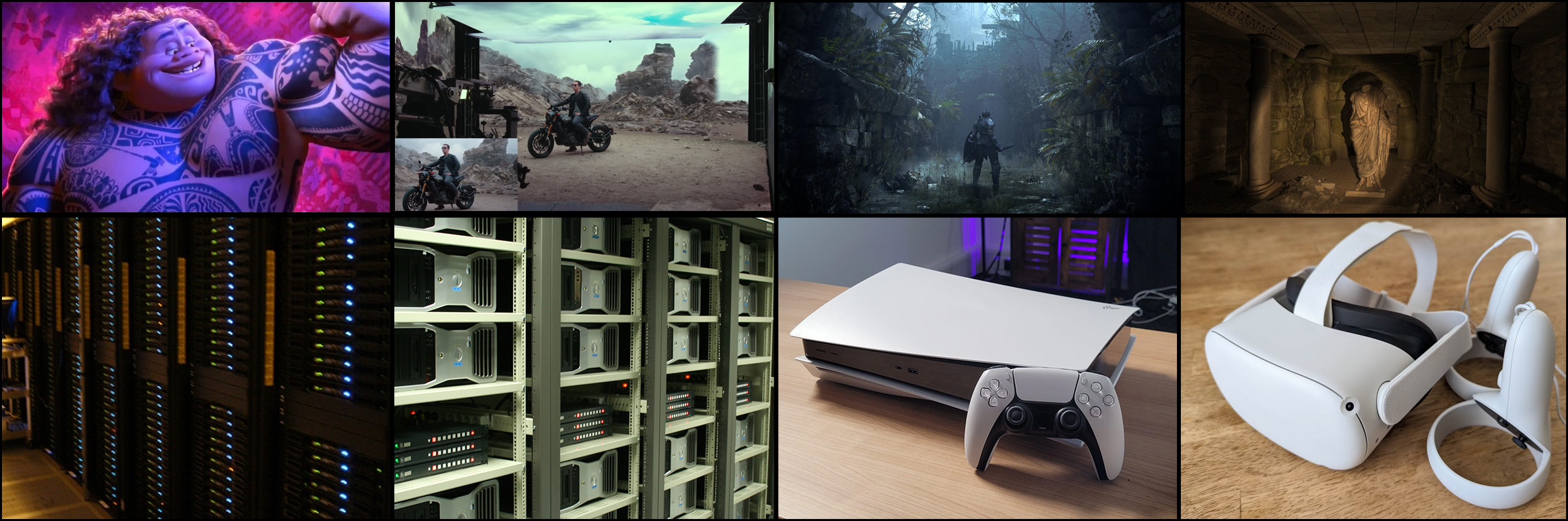 The border between offline and real-time rendering is today significantly blurred, as graphics processing units become more and more powerful, while algorithms and graphics pipelines used exclusively in offline rendering in the past begin to deliver visuals at interactive frame rates. Real-time rendering, exploiting pre-processed lighting to a large extend, is used for responsive virtual filming sets, where the background is produced and updated on the fly on massive display panels. Photorealistic simulations can be run interactively and hybrid rendering pipelines and advanced hardware-assisted up-scaling and de-noising functionality help close the fidelity gap between the offline and real-time rendering world.
