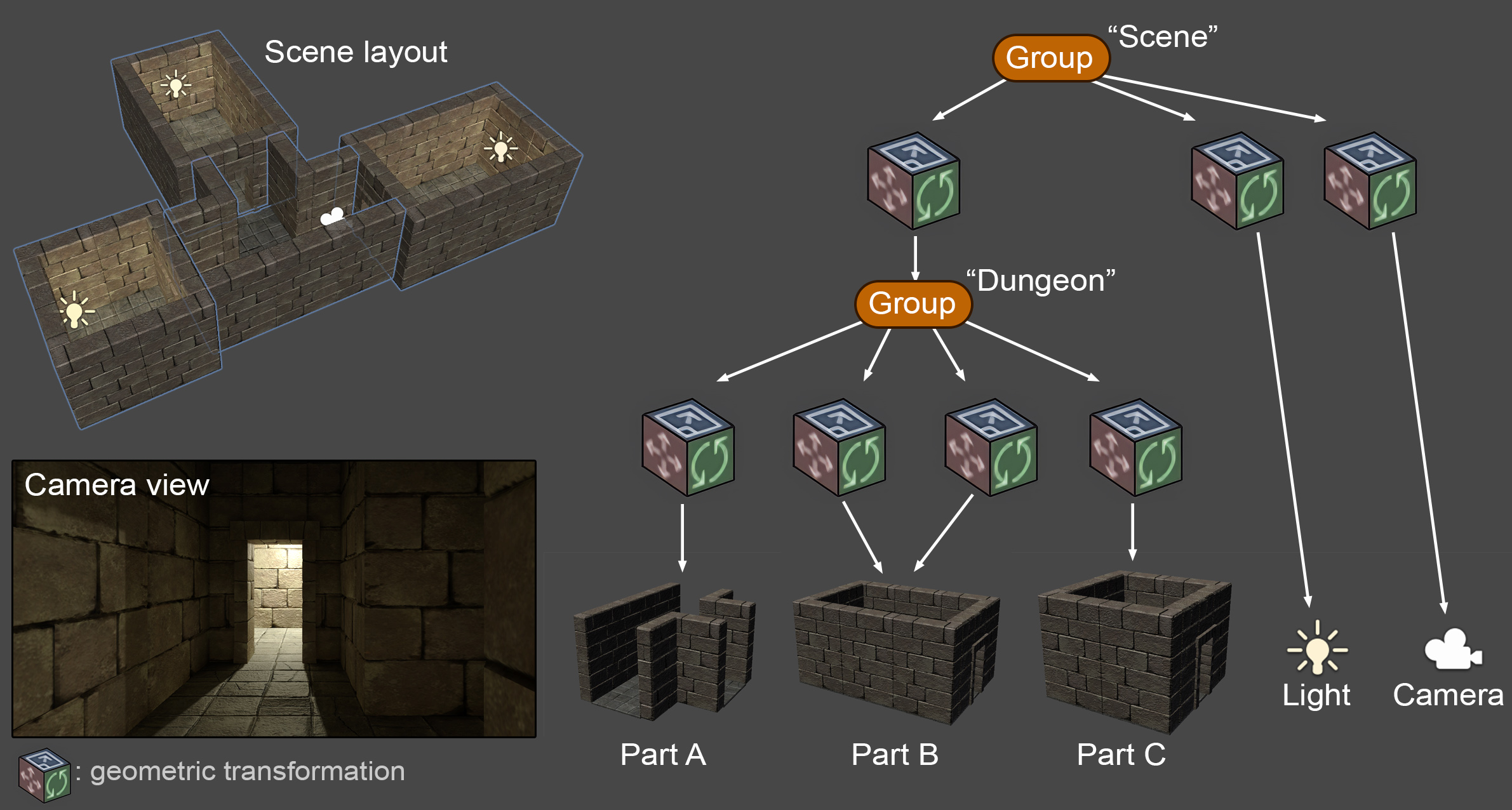 As shown in the following figure, geometry and other elements, such as lights, action triggers, virtual cameras etc. can be hierarchically grouped together to form meaningful aggregate objects, which can help us better organize the virtual environment. This hierarchical organization is called a scene graph and can be beneficial both for the creator, to conceptually and ontologically cluster and reuse elements of the environment, and for the rendering system, as clustered entities can be collectively processed and displayed more efficiently. For example, a group of objects can be disabled for rendering as invisible or inactive, resulting in all included, dependent elements (this node’s "sub-tree") being inherently disabled as well. In the case presented in the figure, disabling the scene graph node "Dungeon" would result in also disabling all nodes stemming from it, i.e. the references to Part A, Part B and Part C.