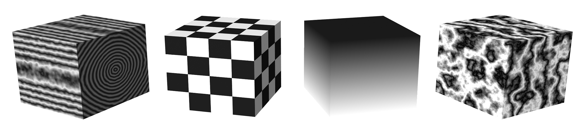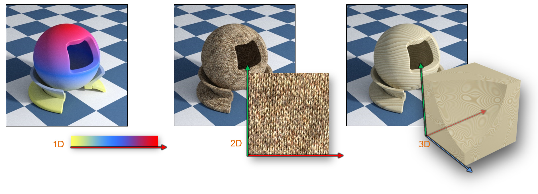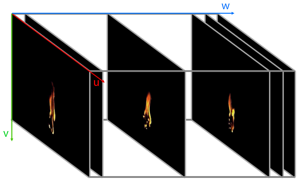 A one-dimensional texture is simply a linear collection of different values, materializing a simple look-up table indexed by a single parameter. Similarly, a two-dimensional texture is akin to a bitmap and it is typically implemented and stored as such, too. Digitized, created and processed content often ends up as a 2D texture to be used for rendering and, aside from 3D geometry, this is the most common asset used in interactive and offline rendering applications. Contrary to a 2D texture map, a 3D image texture is constructed so that it represents the variation of an attribute over the entire 3D domain, including the internal volume of objects instead of just their surface. In this sense, this is a volumetric texture. Alternatively, the three-dimensional parameterization can be split into a 1D stack of 2D textures, representing the evolution of a two-dimensional texture over time. For example, a sequence of frames from a video can be loaded into a 3D texture, each frame stored as a slice of the volume texture. We can then play back and loop through the slices of the volume, presenting an alternative 2D texture map according to the 3rd texture parameter (time).