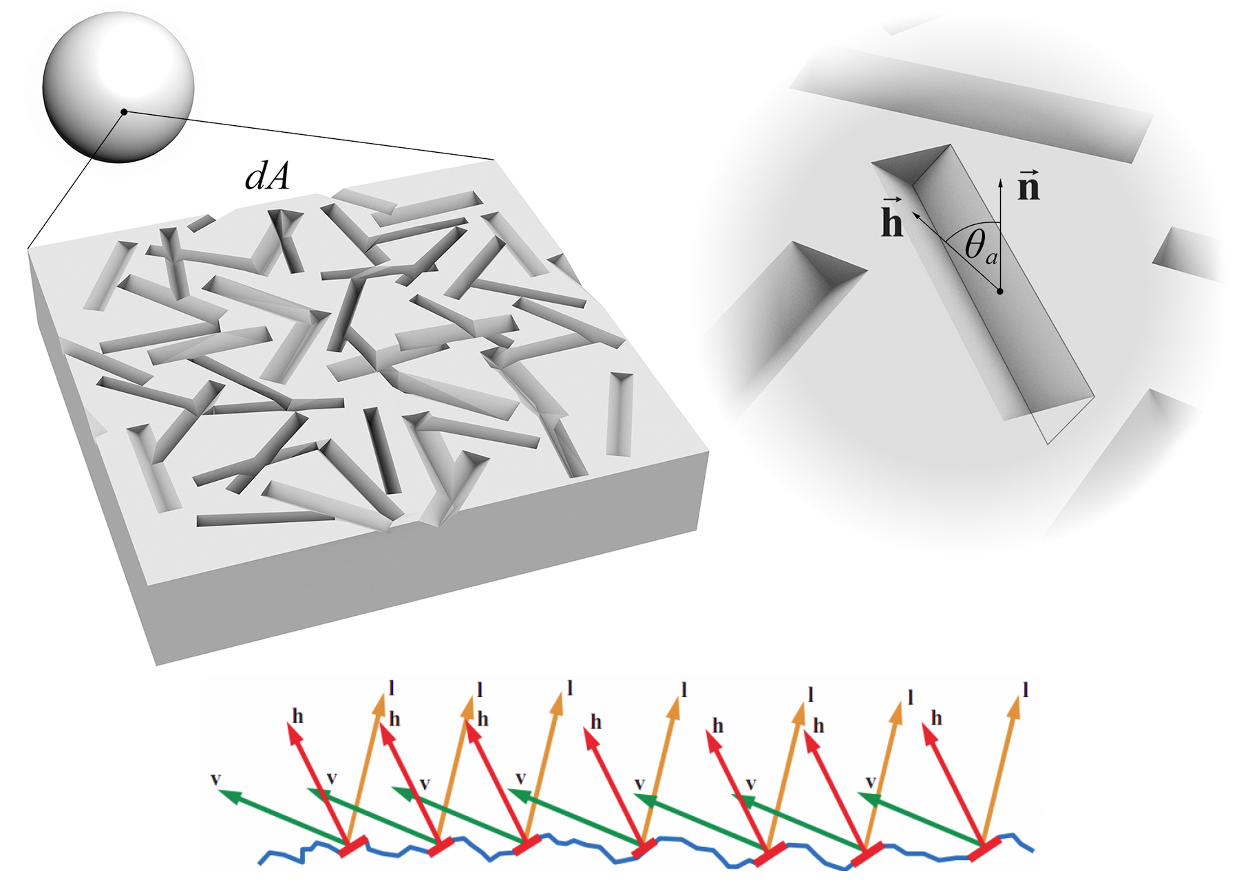 The shading models that have been developed based on the Torrance - Sparrow micro-facet model provide a reflection (and transmission, respectively) fraction of the total reflected (or refracted) energy that passes from a given incident light direction to an outgoing observation direction and vice versa. The BRDF (BTDF) is parameterized according to surface roughness, which in turn controls the statistical behavior of the micro-facets’ alignment. The primary computation inside such a model answers to the question "what is the percentage of the micro-facets that are aligned in such a way so that light is deflected from the given input direction to the given output direction" (see bottom inset in the figure above). Additional factors are considered for further dampening the response of the surface to light, such as the occlusion caused by the microscopic grooves themselves, when light strikes or leaves the surface at a low angle.