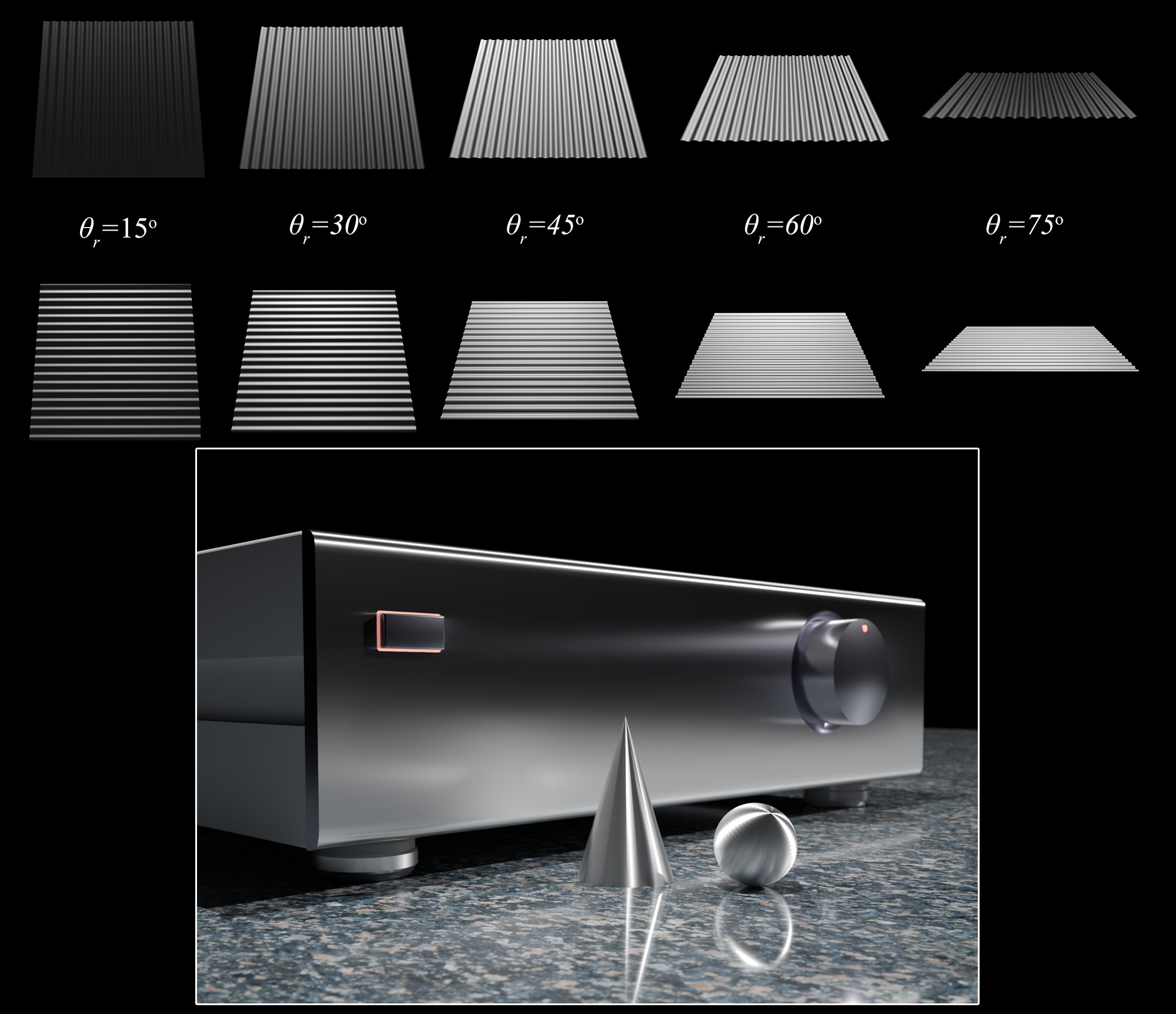 Rough surfaces affect both the reflected and the refracted light similarly, as they deflect light in multiple directions, according to their micro-structure. The conceptual model that is commonly used for deriving the formulas for the BRDF and BTDF of rough surfaces is the Torrance - Sparrow micro-facet model (Torrance and Sparrow 1967). In this widely adopted modeling of rough materials, a surface is assumed to be composed of long symmetric V-shaped grooves, each consisting of two planar facets tilted at equal but opposite angles to the surface normal (see figure below). In order to estimate the response of the reflective surface to a given direction, the facets are considered perfect mirrors and therefore reflect light only in the direction of perfect reflection. The elevation (slope) of the facets as well as the orientation of the cavities (azimuth) are determined by a statistical distribution that characterizes the surface finish.