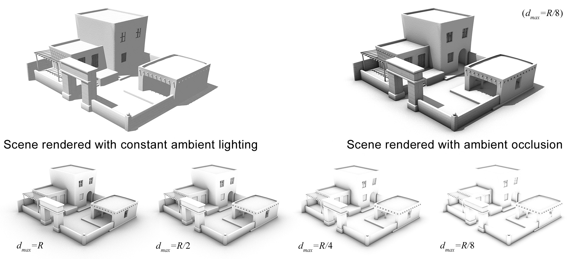 A key observation is that, even uniform illumination, cannot illuminate all surfaces equally, since different surface points are exposed in a different manner to light, because other parts of the models and the environment are in the way (Zhukov, Iones, and Kronin 1998). The term ambient occlusion (AO) became popular in the early 2000s, to express how obscured a point is, i.e. how inaccessible it is by uniform, distant lighting. Practical implementations usually compute 1 - AO (ambient "visibility") and still call it ambient occlusion, since this is a term multiplicatively applied to lighting to suppress it, where occlusion is high. It is a normalized term, ranging from 0 (full occlusion) to 1 (full visibility). AO can be precomputed for locations on the geometry per object, either for that object in isolation or within a complete virtual environment, and stored in texture maps or as vertex information (usually the former).