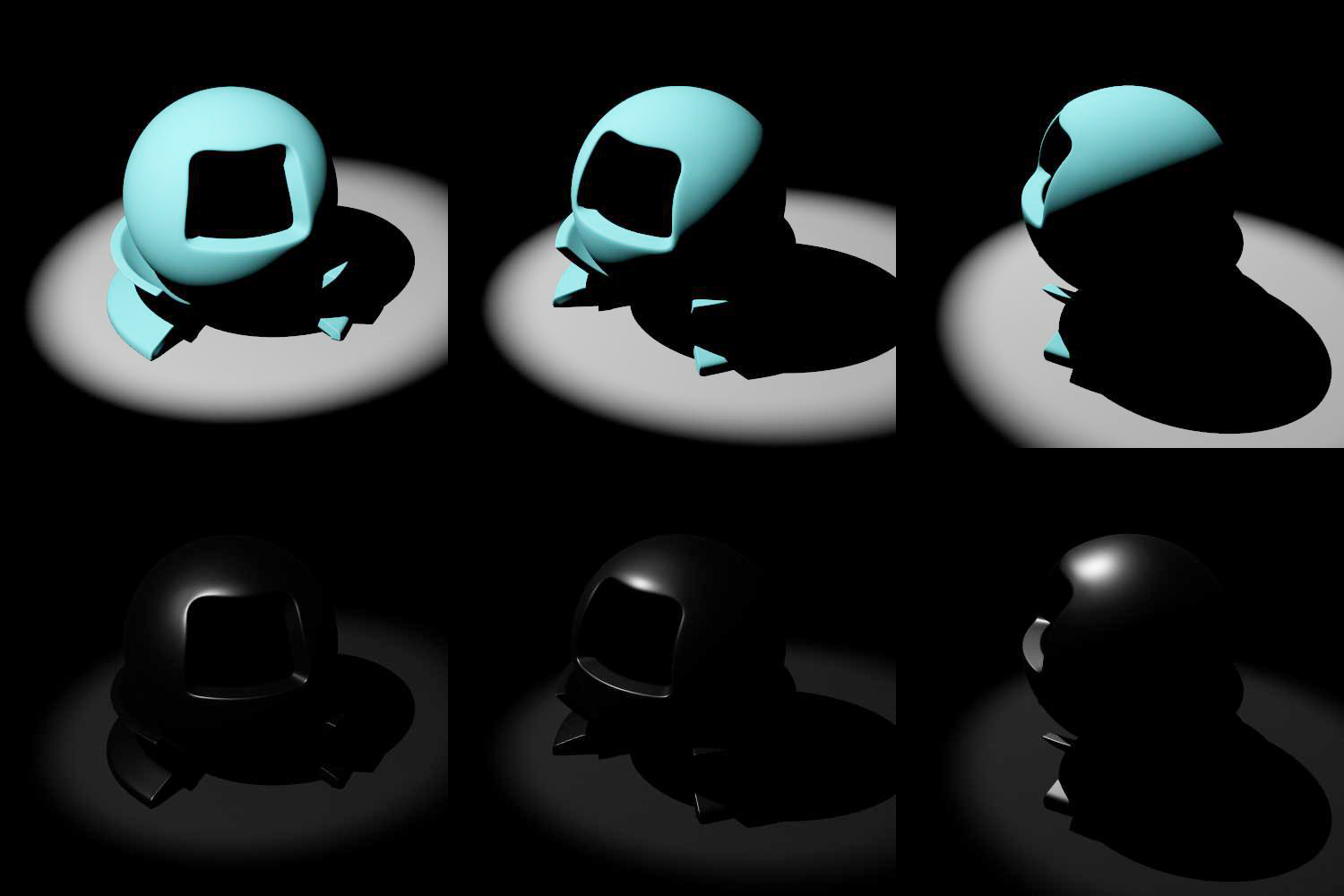 A shading model may attempt to model an as faithful to the physical world light interaction as possible, deliberately simplify computations for efficiency or even attempt to model a non-photorealistic surface response to lighting, for artistic purposes. Some examples are shown below.