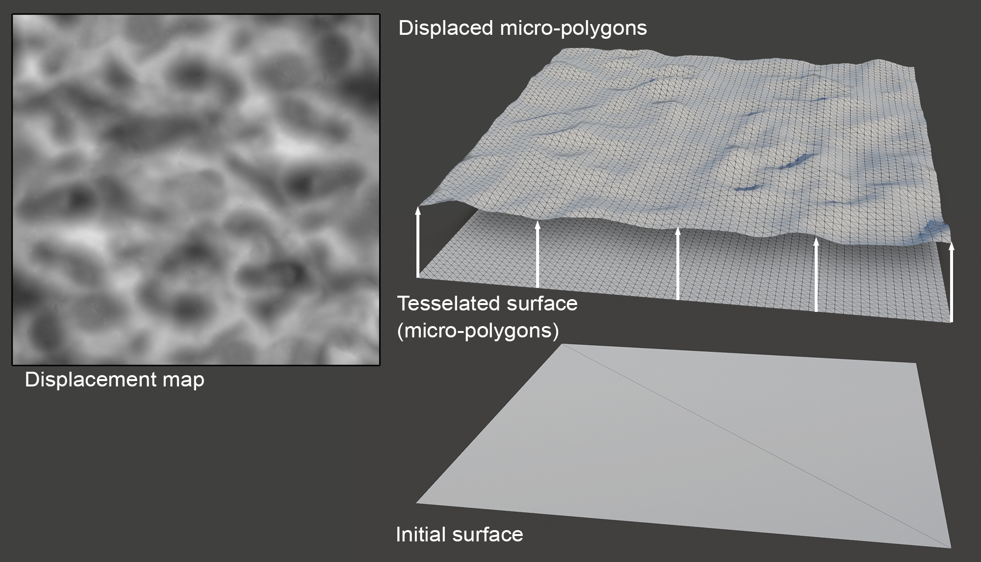 Displacement mapping creates relief patterns on a surface by moving the vertices along the original surface normal direction or along a predefined vector according to the intensity of the texture evaluated at each point. The elevation texture is a scalar height field representing the relief pattern, called displacement or height map. Needless to say, since the displacement map carries an elevation pattern that is far more detailed than the intrinsic geometric structure, it the latter is incapable of deforming in any meaningful way to match the displacement map’s definition. Therefore, during rendering, the original geometry is temporarily subdivided to match the lowest sampling rate between the screen space and the texture space, while filtering the height map as per typical texture minification.