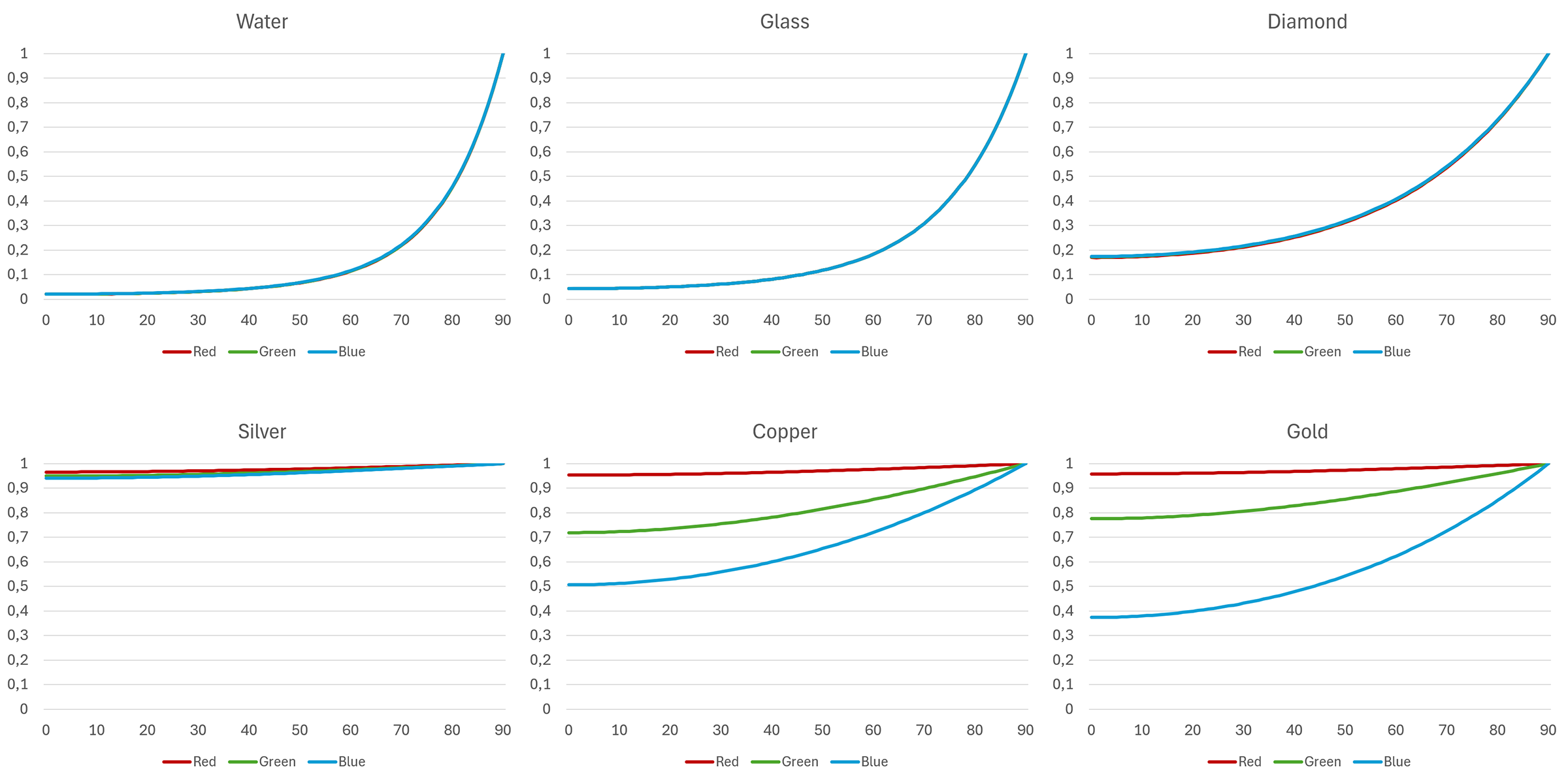The reflectance of many metals is heavily dependent on the wavelength of incident light, tinting the reflection. Two characteristic metals are gold and copper, shown in the plots above.
