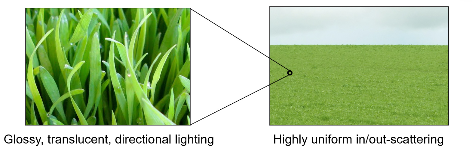 The grass blades, when observed at close distance, are in general glossy and translucent, with a directional reflection and sub-surface scattering that create view- and surface-orientation-dependent lighting. Zooming out to view an entire field of grass, the appearance is entirely different: The resulting scattered illumination is highly diffuse and uniform, like observing a cloth made of a dense woven fabric. The individual structure of the blades that we could see at high magnification was macro-scale geometry and the smooth surface and low profile of each blade was defining the observed material. When observing the field, the grass blades became micro-structure for the subtended area within each pixel and, combined with the mutual occlusion of the blades, provided a completely different statistical landscape and therefore illumination.