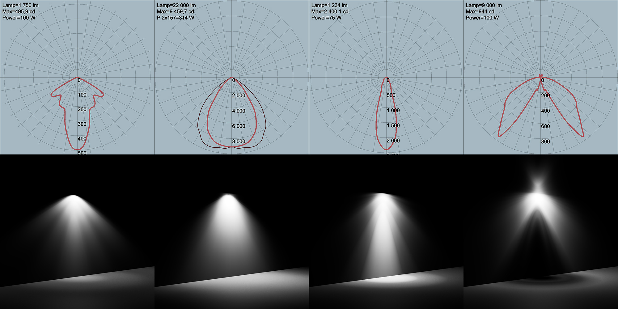 According to the definitions of photometric quantities, in a physically-correct rendering pipeline, it is common to describe virtual light sources using the most suitable specification, interchangeably. When directional aspects of lighting are important for the application, i.e. how much light is emitted in a particular direction, intensity is often the quantity of choice. When simulating real luminaires (lighting system elements), graphics simulations may read and adjust the light source’s directional emission according to a photometric web profile. This diagram, associates luminous intensity with a particular emission direction, as shown in the following figure. The Illuminating Engineering Society (IES) has defined a file format, the IES profile, which describes a light’s distribution from a light source using real world measured data.