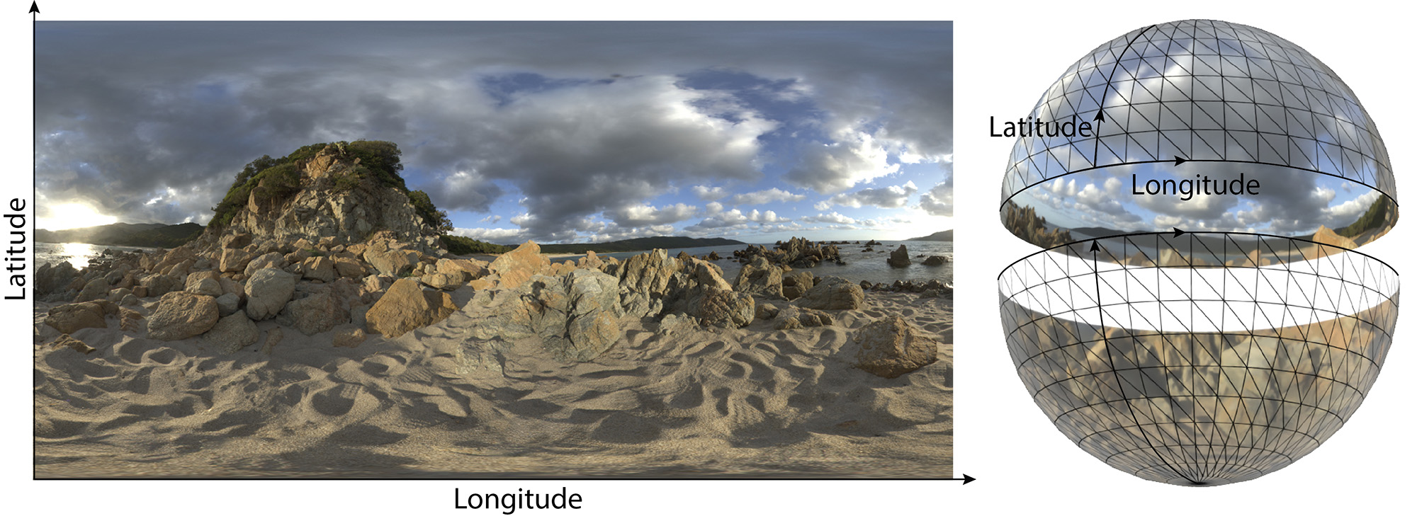 Latitude - Longitude environment maps simply map texture coordinates to the polar coordinates of the look-up direction, i.e. elevation (latitude) and azimuth (longitude). This is probably the most intuitive mapping function between the spherical domain of unit directions and the rectangular texture space. Single-image lat/long environment maps are easy to find and use in most applications, since the indexing of the texture map is straightforward.