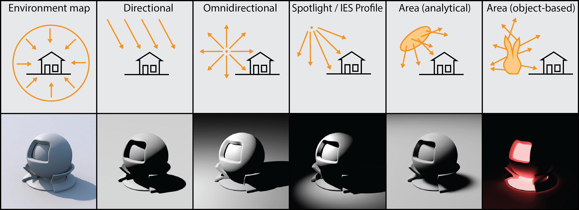 As mentioned in the introductory material, any image synthesis task that attempts to simulate or imitate how objects appear in the physical world, needs to also describe the energy that is provided to the virtual environment, which the various geometric element and their materials interact with and whose captured response on the virtual image sensor(s) forms the final image, according to a rendering pipeline. Even for non-physically-based rendering tasks, such as illustrative rendering and data visualization applications, one or more assumed virtual lights are present in order to provide shading variations on the 3D data that are rendered.