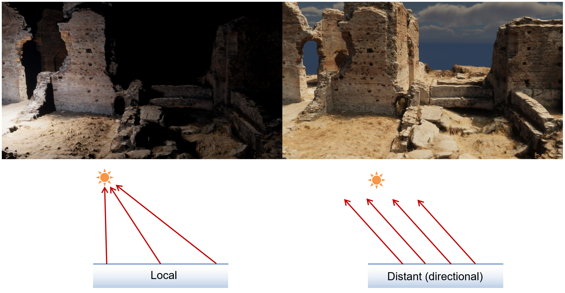 Light sources can be broadly categorized according to how they are defined and what is their relationship with the virtual environment. At a high-level, we can distinguish lights as local and distant. Local light sources represent mathematically defined luminaires that can be positioned within the environment at precise locations, or the emissive bodies or surfaces of geometric elements of the scene. For these light sources, the emission characteristics represent what light these elements output at the source, i.e. at the locations of origin on their geometry or position in space. The incident light contribution of these sources on the lit geometry is then estimated using the appropriate light transport equations, usually involving the attenuation of energy as it disperses through space.