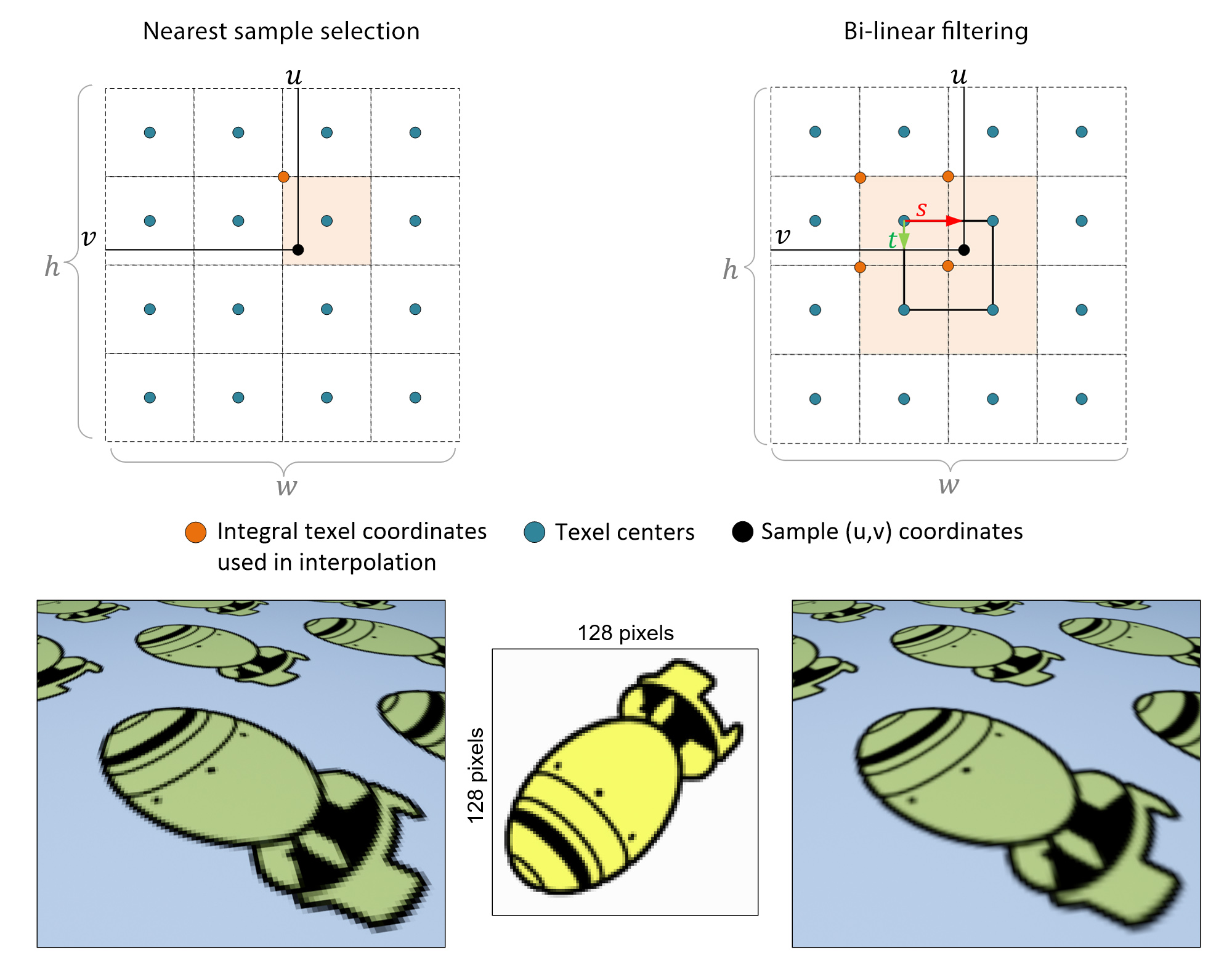 However, as demonstrated in the following figure (left), when the texture coordinates of multiple samples on the polygonal surface are eventually mapped to the same nearest texel on the texture map, we have a situation that is called texture magnification and there is when pixelization occurs. The bitmap texels are visibly magnified in view, resulting in an often experience-breaking visual artifact. This is due to the fact that the sampled information on the texture is fixed and limited while the magnification resulting from the projection of the textured geometry is not. The texture simply has no more detail to sample and visualize. We usually attempt to alleviate the problem by performing some form of filtering that cannot of course increase the fidelity of the texture, but can rather smooth the texture values. The typical way to address the problem is to look up more texels in the vicinity of the texture coordinate location and perform a weighted average of them. The most common way to do this is bilinear interpolation of the four neighboring texels; the contribution of each texel is weighted by the proximity of its center to the sample location.
