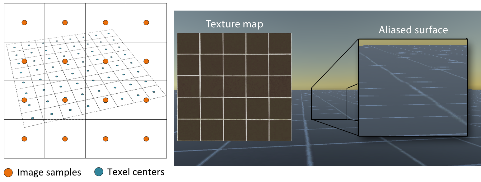 When texture-mapped surfaces are projected in such a way that a single image sample corresponds to multiple texels in the texture space (see figure below), the texture is under-sampled and the textural information cannot be properly reconstructed, leading to serious and quite noticeable aliasing artifacts, severely impacting the image quality.
