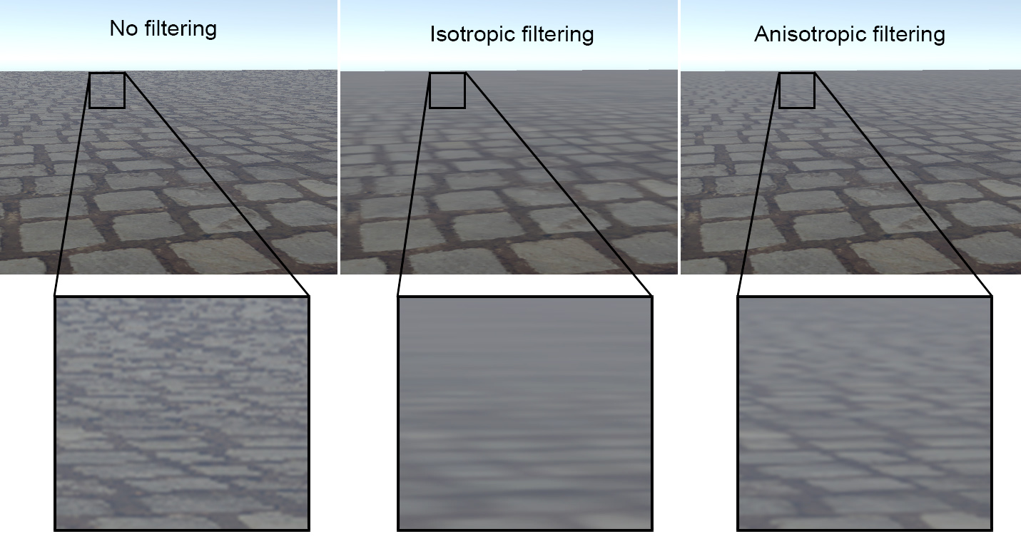 In its simplest and most compact form, the pre-filtered texture is processed using a 1:1 filter kernel (e.g. square), assuming the projection of the image pixel on the texture space is a compact shape. This process is called isotropic filtering. However, this is often not the case, as the texture area covered by the pixel can be elongated or tilted. In those cases, and to avoid aliasing, the filter kernel size is overestimated, resulting in a blurry appearance of the textured surface, as shown in the middle inset of the following figure.