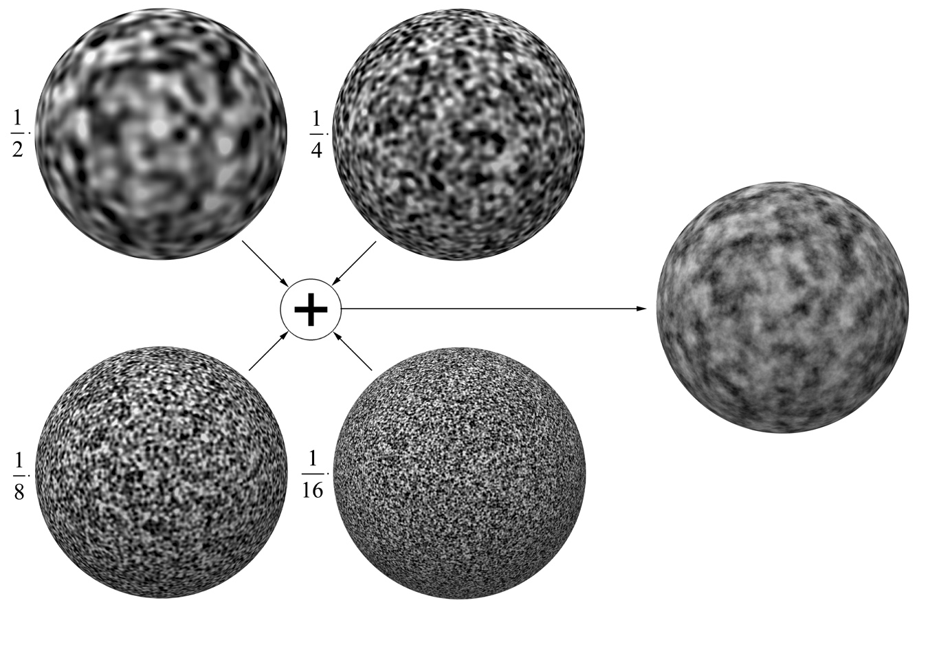 noise is a recurring random pattern in the physical world. It is simply the superposition of random patterns of increasing detail. However, the more detailed the pattern, the smaller its contribution to the final pattern. More precisely, if is the detail level (maximum frequency) of the random pattern, its contribution to the noise is inversely proportional to , hence the name. Grainy materials, smoke and turbulent media can be efficiently represented in high detail using noise, by overlapping Perlin noise at different scales.