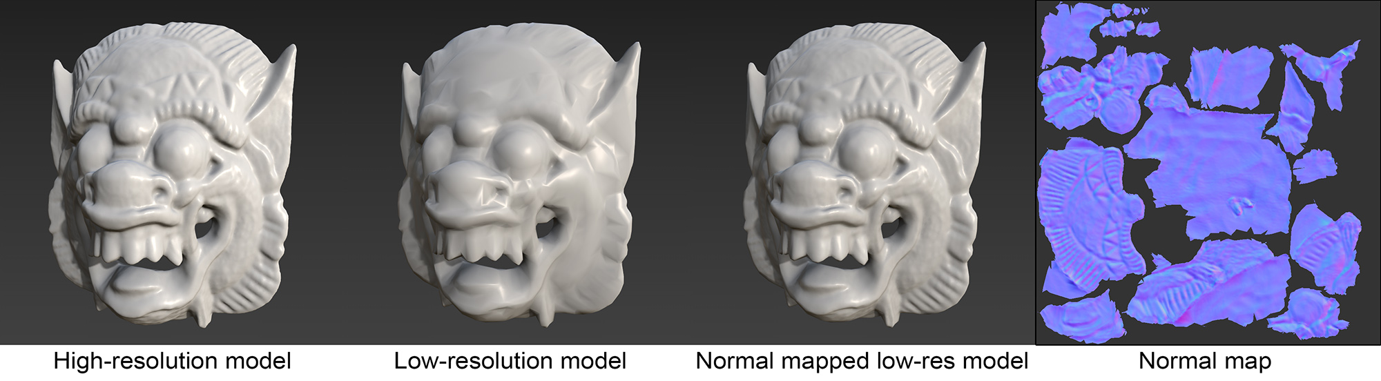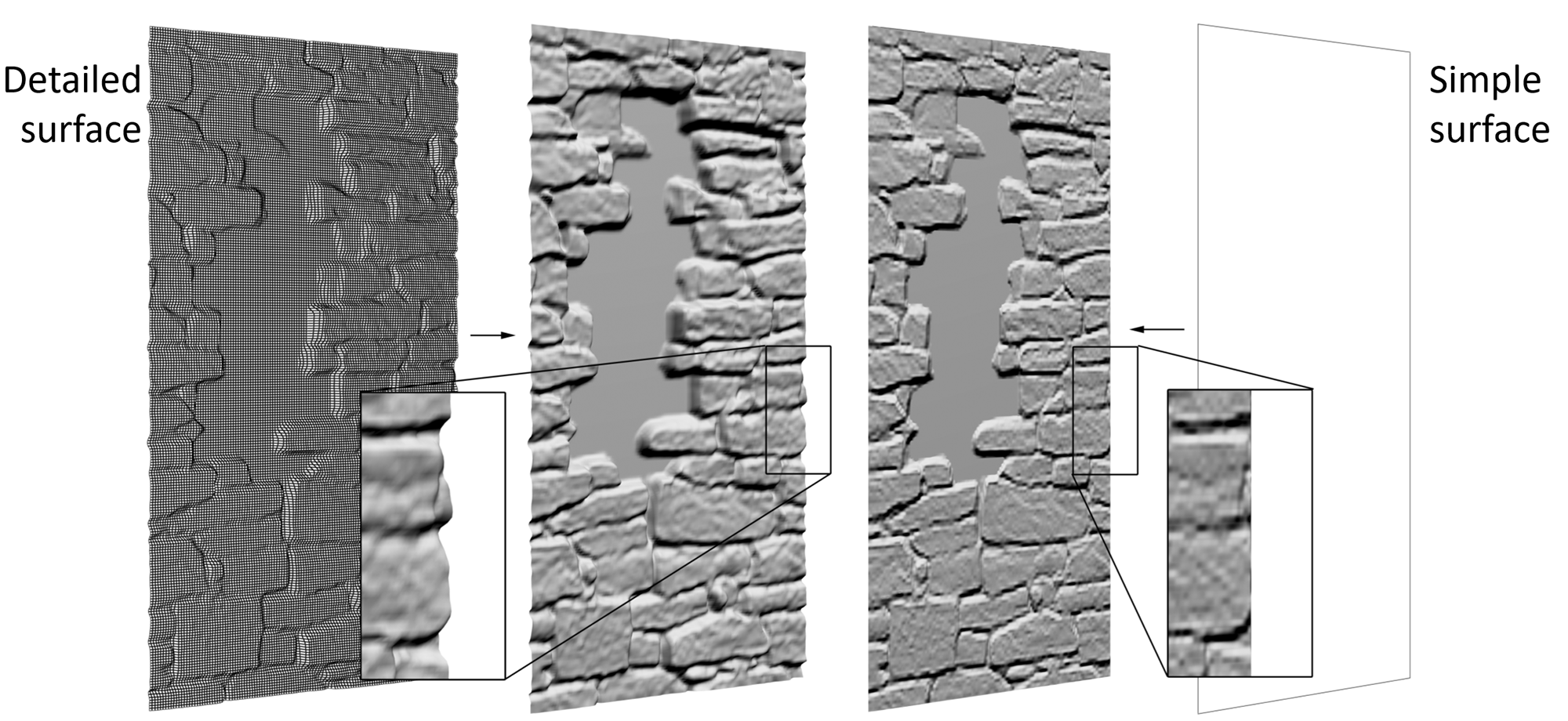 When we have a high-resolution 3D model of an object that must be simplified for practical rendering or geometric processing, we can extract the geometric elevation or surface direction variations from the high-resolution model version and map it onto the low-resolution model during rendering, either as a displacement map or as a normal map. This way, although the polygonal model is simplified, we can still visualize its details with sufficient fidelity to be used in interactive rendering applications.