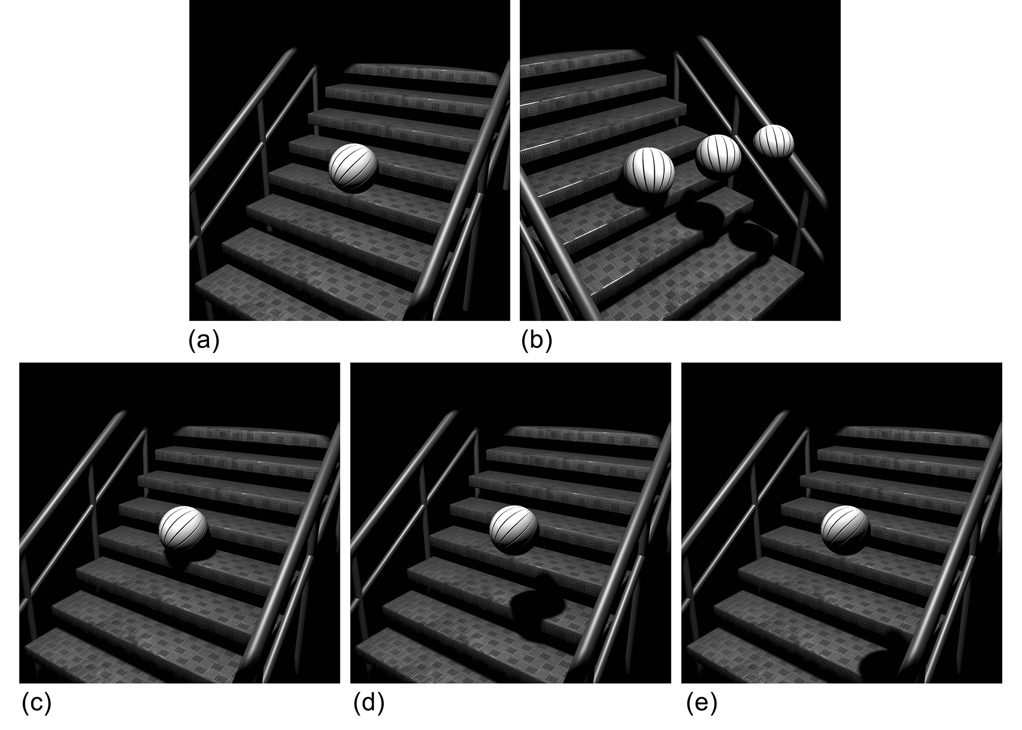 They help us place the objects in the environment, providing clues about relative distances. This is demonstrated in the following figure. The closeness or detachment of an object’s shadow is indicative of its relative distance to its surroundings and its relative scale.