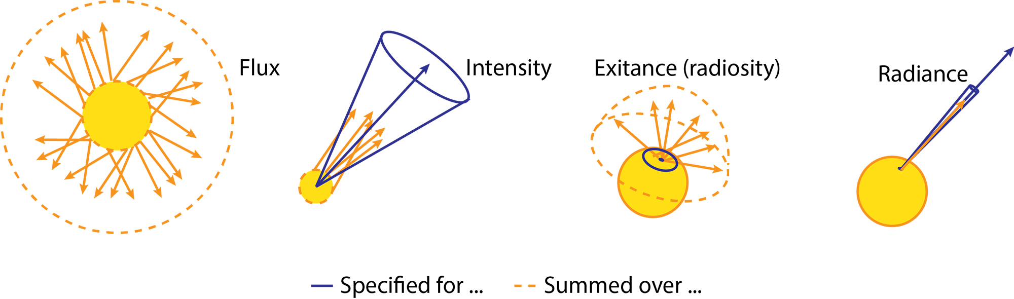 Light-emitting bodies provide energy to the environment in the form of electromagnetic radiation in the visible spectrum, which can be quantified and measured in standard energy units, such as Joules (in the SI system). However, describing a process using energy is not meaningful as energy is constantly converted to and from light, piling up. Therefore we cannot successfully describe a steady state of emission and light transport using energy. However, if we consider the rate of energy emission, absorption and scattering, that is, energy over time, this describes energy exchange in a steady manner. The rate of radiant energy provided or expended over time is the radiant power or radiant flux , measured in Watts (W) in the SI system. We are also often interested in describing or knowing how much of the light power exiting or entering a point is concentrated in a particular conical beam. This is called radiant intensity and is expressed in Watts per steradian. A steradian is a a the unit of a dimensionless quantity called a solid angle, which describes the opening of a beam in space and is the three-dimensional counterpart of an angle in two-dimensions.