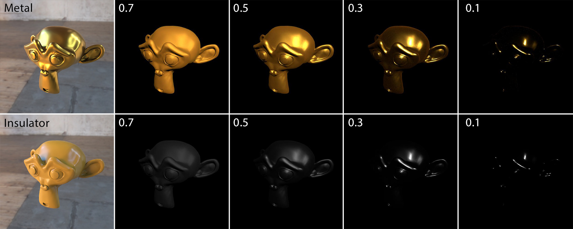 As can be observed in the above figure, increasing the roughness spreads the incident light into a wider lobe of scattering directions. Due to the requirement for energy preservation, though, a physically correct model suppresses the brightness of the reflected light so that the total energy leaving the surface in all directions remains the same, regardless of roughness.