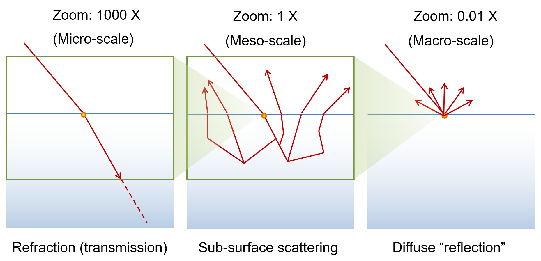 The scale at which we observe and measure the scattering of light is very important to the determination of the general appearance of objects. If we could zoom in, right at the point of incidence of light, the latter would not have traveled any distance inside the medium and on a smooth surface we would only observe the refraction of the light as it starts traversing the mass of the object in a new direction, without any out-scattering. As we zoom out, we will start registering light that gets scattered as it now moves deeper into the medium. Light will re-emerge at various points on the surface of entry or elsewhere, depending on the intensity of the scattering and the absorption of the medium. If the medium does not quickly dampen the luminous energy, it will travel long distances inside the body and we will be able to register light exiting at parts of the geometry that are significantly distant to the point of entry. We collectively call this complex interaction sub-surface scattering. However, if our scale of observation is such that the volume in which we get any noticeable outgoing lighting appears very close to the point of entry of the incident light, then the apparent effect is that of light being diffusely "reflected" on the spot. This is something very common in computer graphics, where the scale of observation is typically meso- and macroscopic, with regard to the typical absorption depth of opaque materials and surface lighting is considered in a discretized manner; you cannot sample (observe) the lighting at a finer level than the pixel unit, without averaging. For most insulators (non-metallic materials), the presence of diffusely back-scattered light is high and characterizes the material in terms of color. However, it has been often erroneously treated as reflected light, while it is not, in the physical (and mathematical) sense.