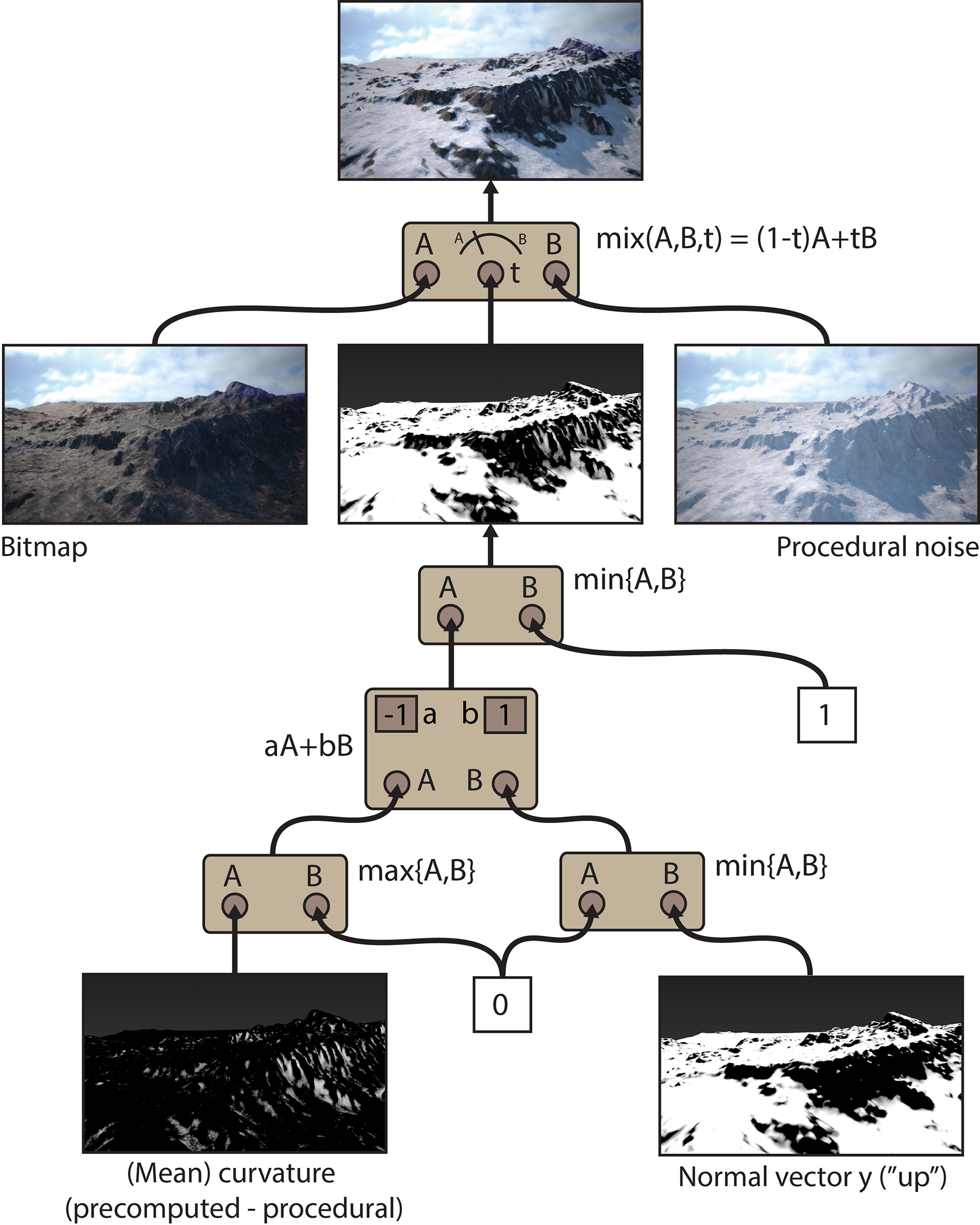 In this particular example, we create a "snow mask" to blend between a rock texture and a snow texture. The Snow procedural color should be applied on shaded points that a) face upwards, towards the falling snow and b) are trapped in deep recesses and are slower to thaw or make difficult for chunks of snow to fall off. A surface feature, the mean curvature for a particular radius has been pre-computed and stored in a texture atlas, with negative values corresponding to recesses and positive values to protrusions. The positive values are clamped to zero via a max operator. Next, we use the Y value of the surface’s normal vector (negative values clamped to zero) and the results of clamped curvature and normal Y are added together, using a simple linear combination mathematical operation node, which we can treat as a procedural element. We retained the negative values of mean curvature, which represent recesses on the surface and therefore they contribute here to the intended "snow" mask after inverting the sign (see -1 parameter on the graphical representation of the node). The result, is clamped to 1 by connecting it with a constant value (1) and can now be used as a linear blending coefficient between a texture image (rocky ground) and and a procedural noise shader (snow) to produce a realistic deposition of snow on a mountainous landscape.